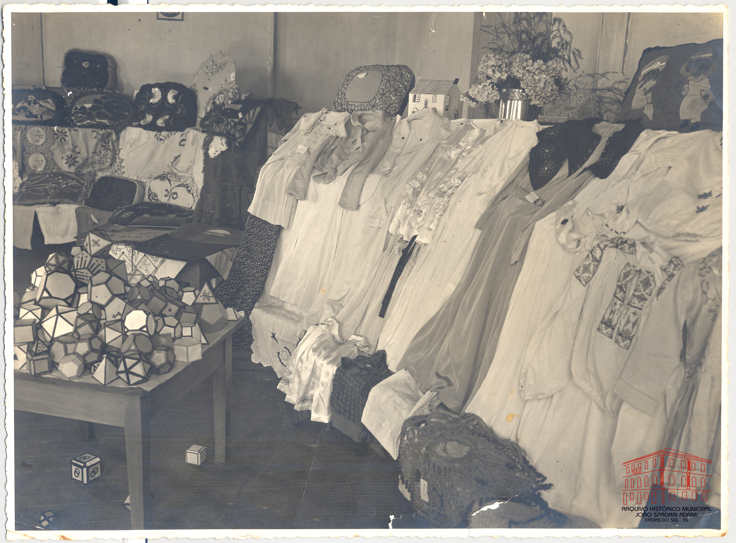 Exposição de trabalhos manuais na Escola Complementar de Caxias sob a direção da professora Maria Amorim.