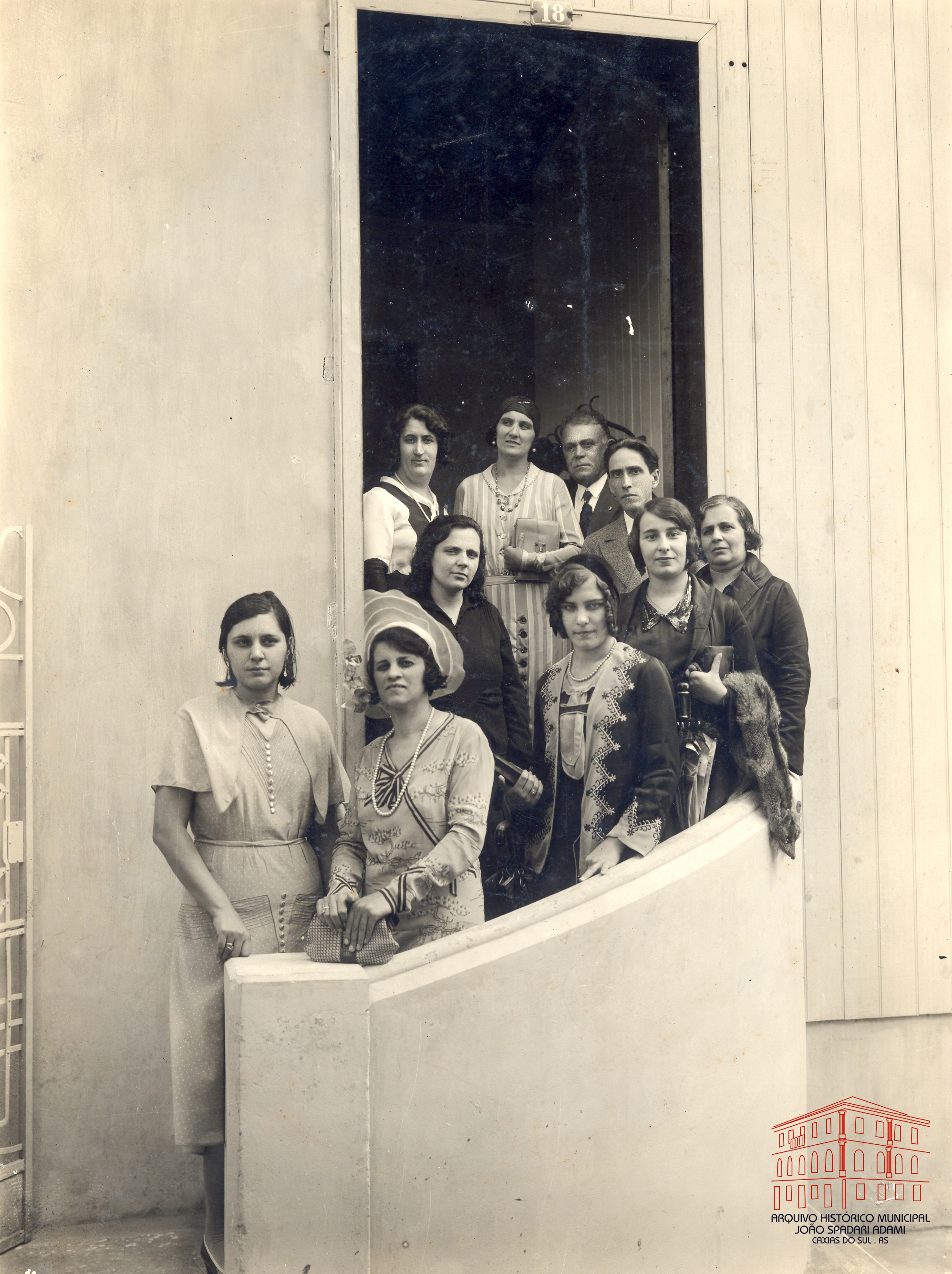 Professoras e Prefeito na entrada da Escola Complementar de Caxias. Ao fundo, à esquerda, diretora Maria Amorim e, à direita, o Prefeito Miguel Muratore. À frente do prefeito, professor Demétrio Niederauer e, ao seu lado, professora Dina Luz Paranhos.