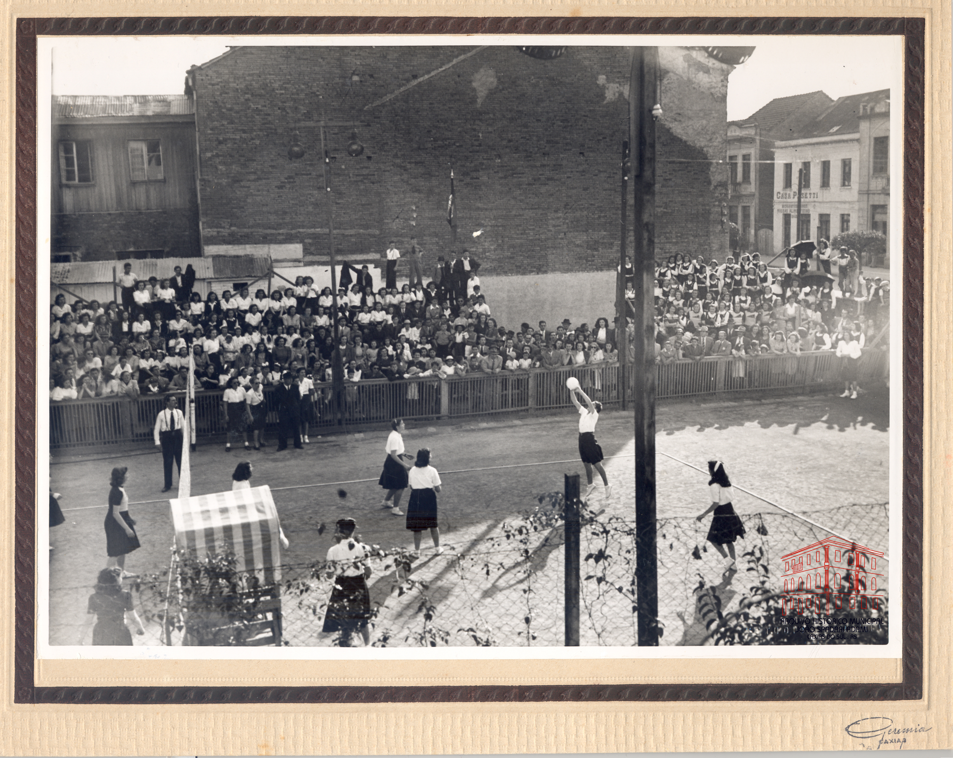 Alunas em atividade esportiva na quadra aberta Grêmio Atlético Eberle, com presença de autoridades na plateia.