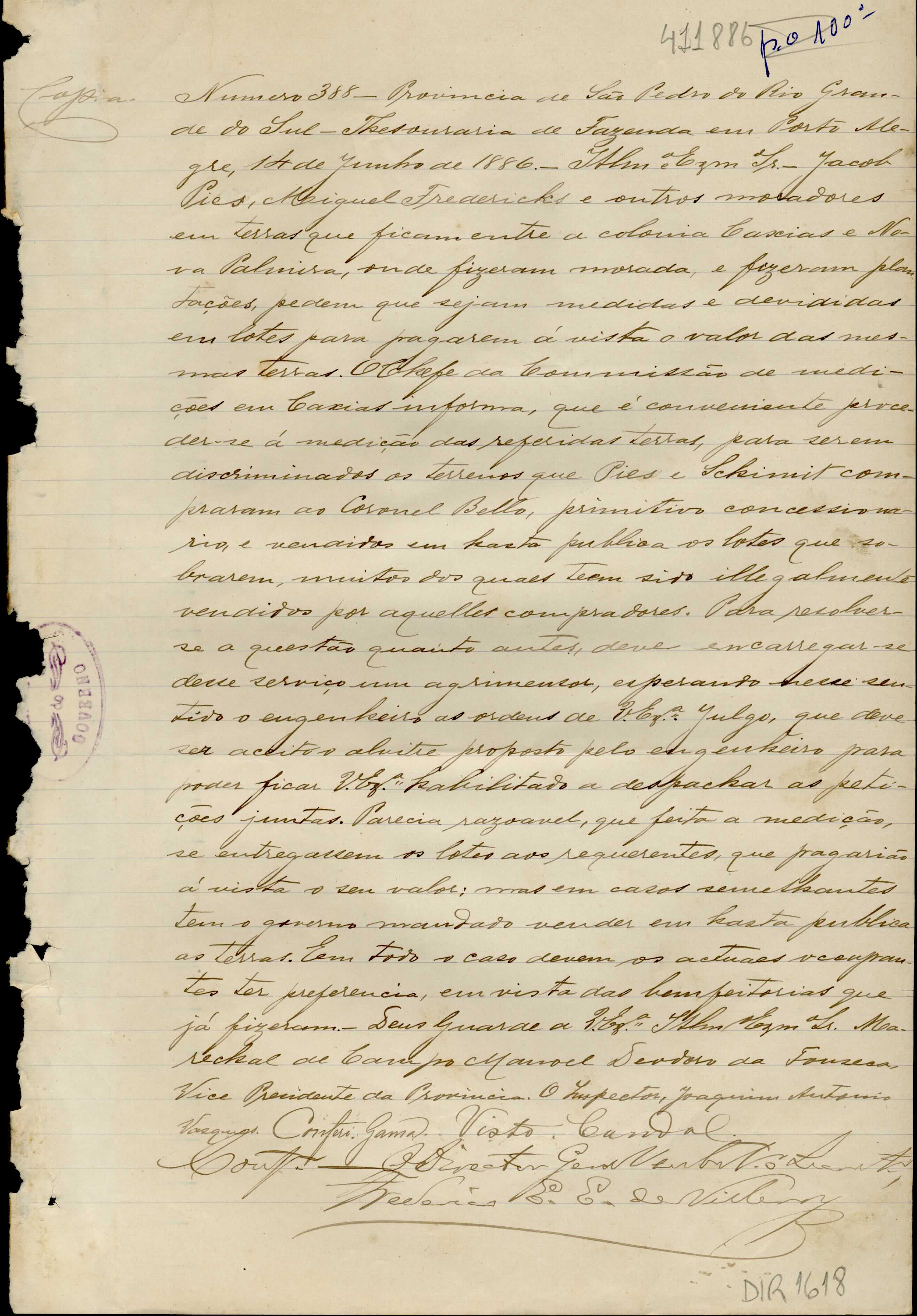 De Joaquim Antonio Vasques - Inspetor da Tesouraria de Fazenda em Porto Alegre, para o Marechal Manoel Deodoro da Fonseca - Vice Presidente da Província. Assunto: Jacob Pies, Miguel Fredericks e outros, solicitam medição e divisão de terras / a Tesouraria da Fazenda recomenda a divisão das terras em lotes para resolver problemas de irregularidades nas vendas.