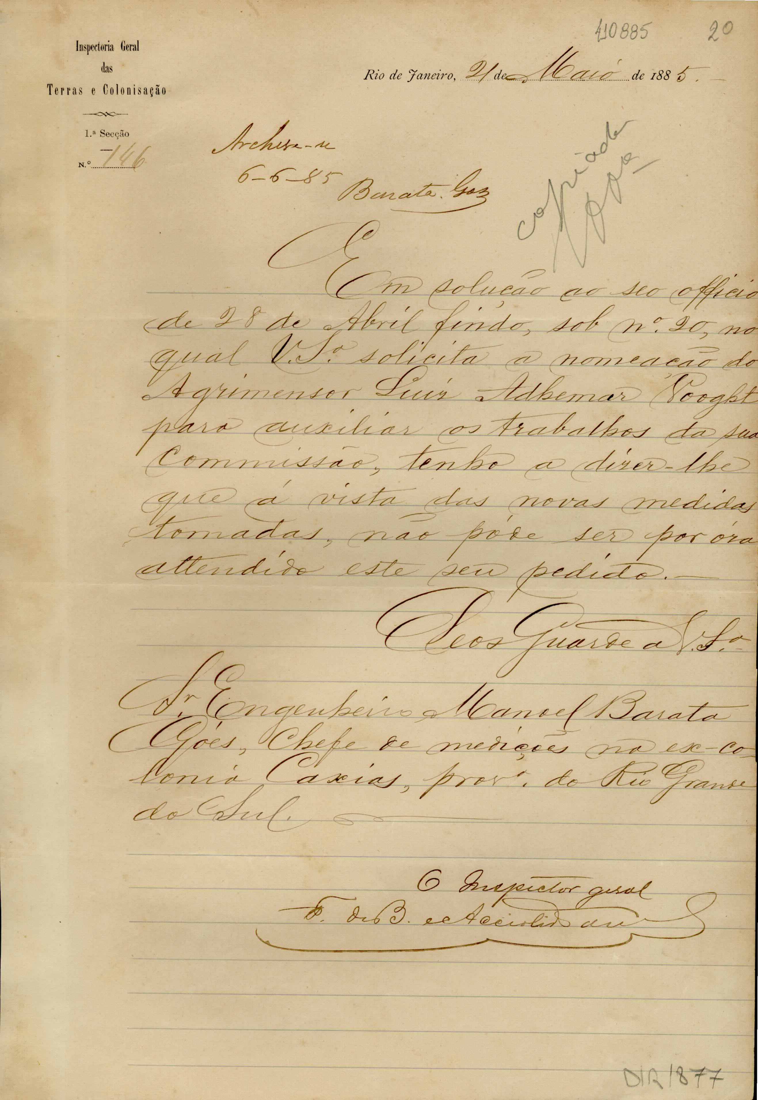 De Francisco de Barros e Accioli de Vasconcellos - Inspetor Geral das Terras e Colonização no RJ, para Manoel Barata Góes - Engenheiro Chefe de Medições na ex-Colônia Caxias. Assunto: parecer sobre a nomeação do agrimensor Luiz Adhemar Vooght para auxiliar nos trabalhos da Comissão.