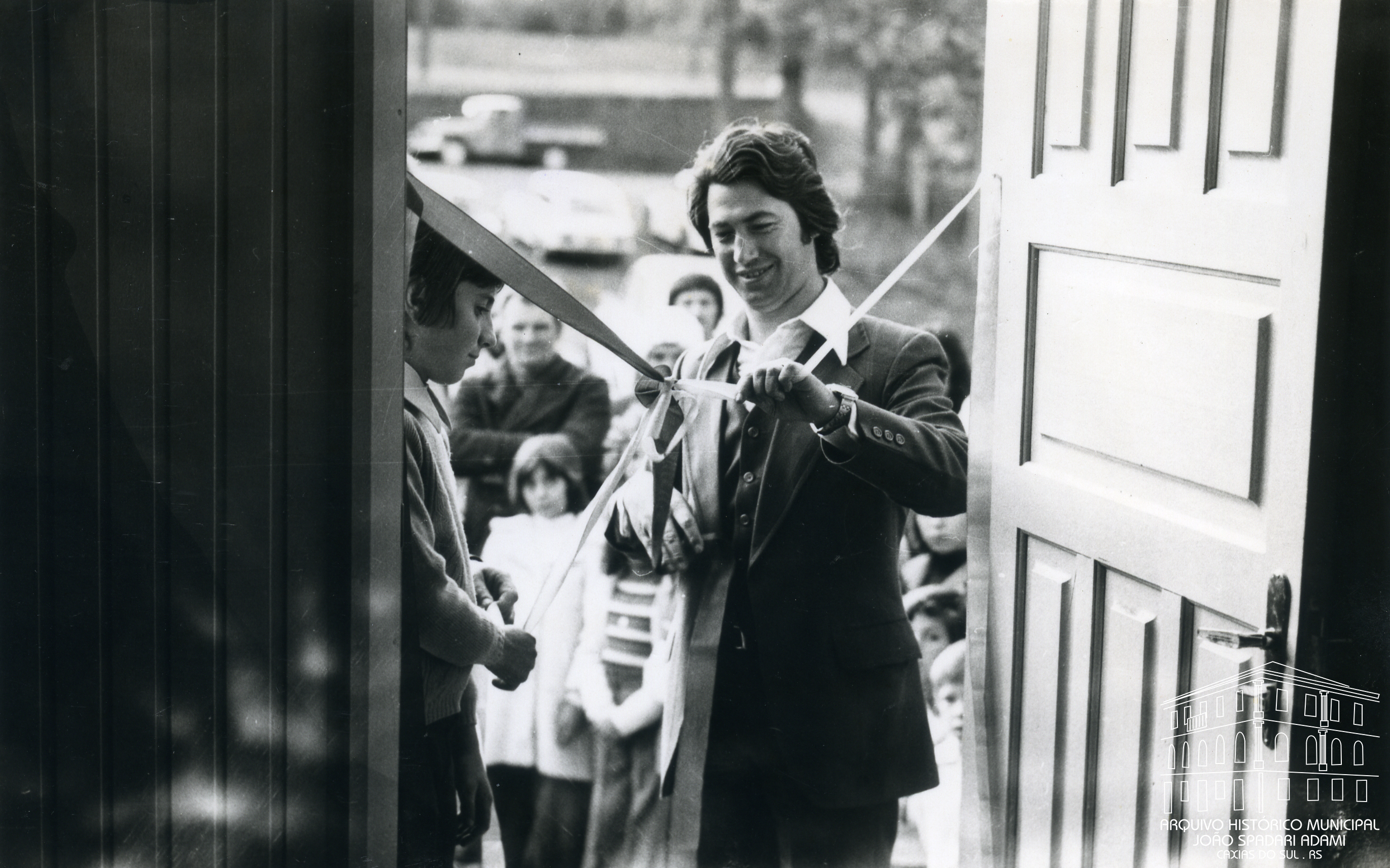 Prefeito Mário David Vanin no descerramento da fita inaugural da Escola Municipal Arnaldo Balvê, situada em Santa Lúcia da 9ª Légua, em 06 de novembro de 1976.