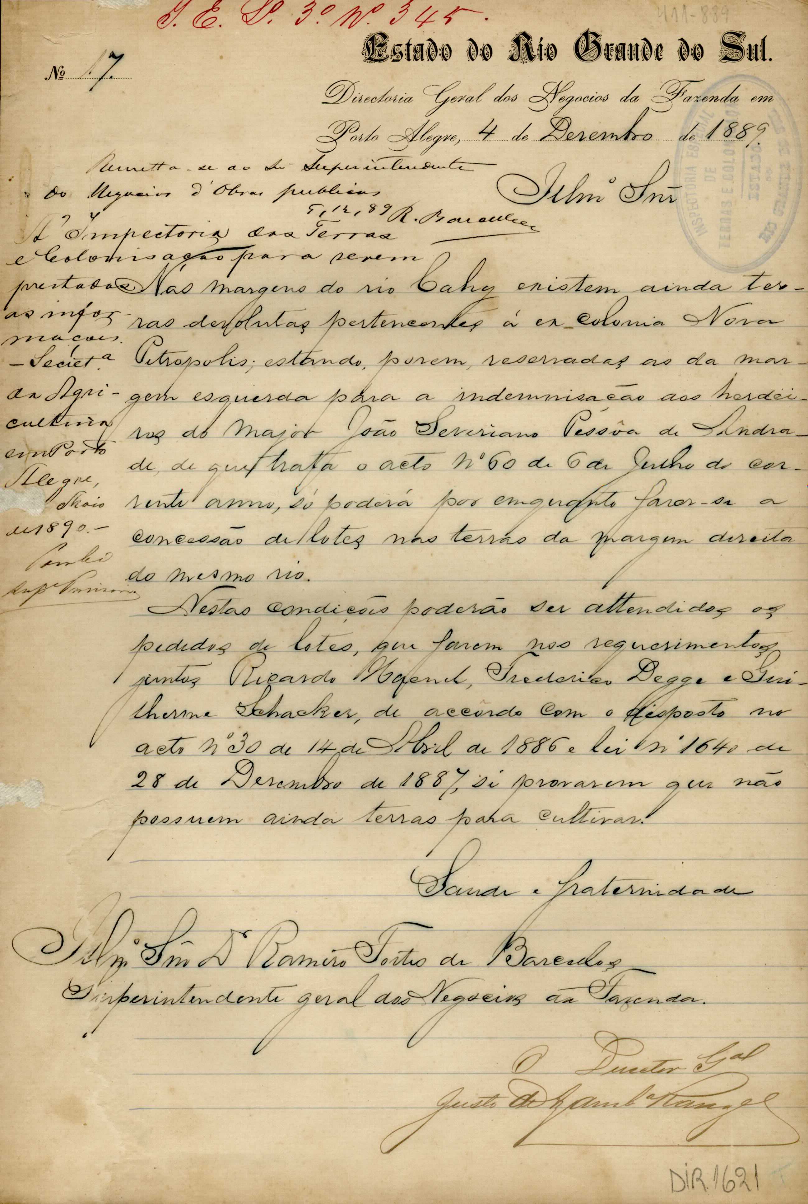 De Justo de Azambuja Rangel - Diretor Geral dos Negócios da Fazenda Provincial em Porto Alegre, para Ramiro Fontes de Barcelos - Superintendente geral dos Negócios da Fazenda. Assunto: instruções para concessão de lotes da margem direita do rio Caí.