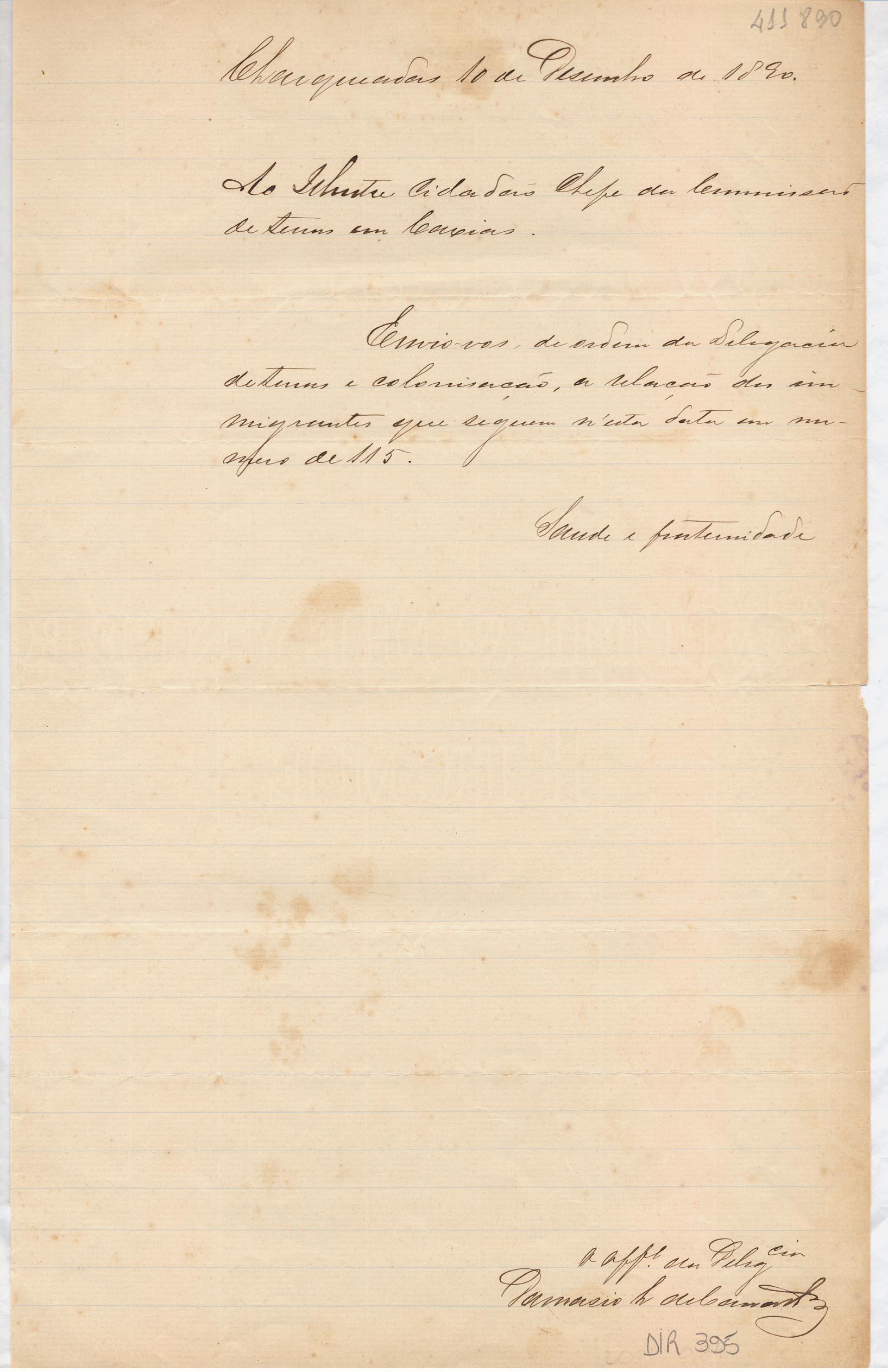 Da Delegacia de Terras e Colonização - Charqueadas, para o Chefe da Comissão de Terras em Caxias. Assunto: envia relação de imigrantes. Local: Charqueadas.