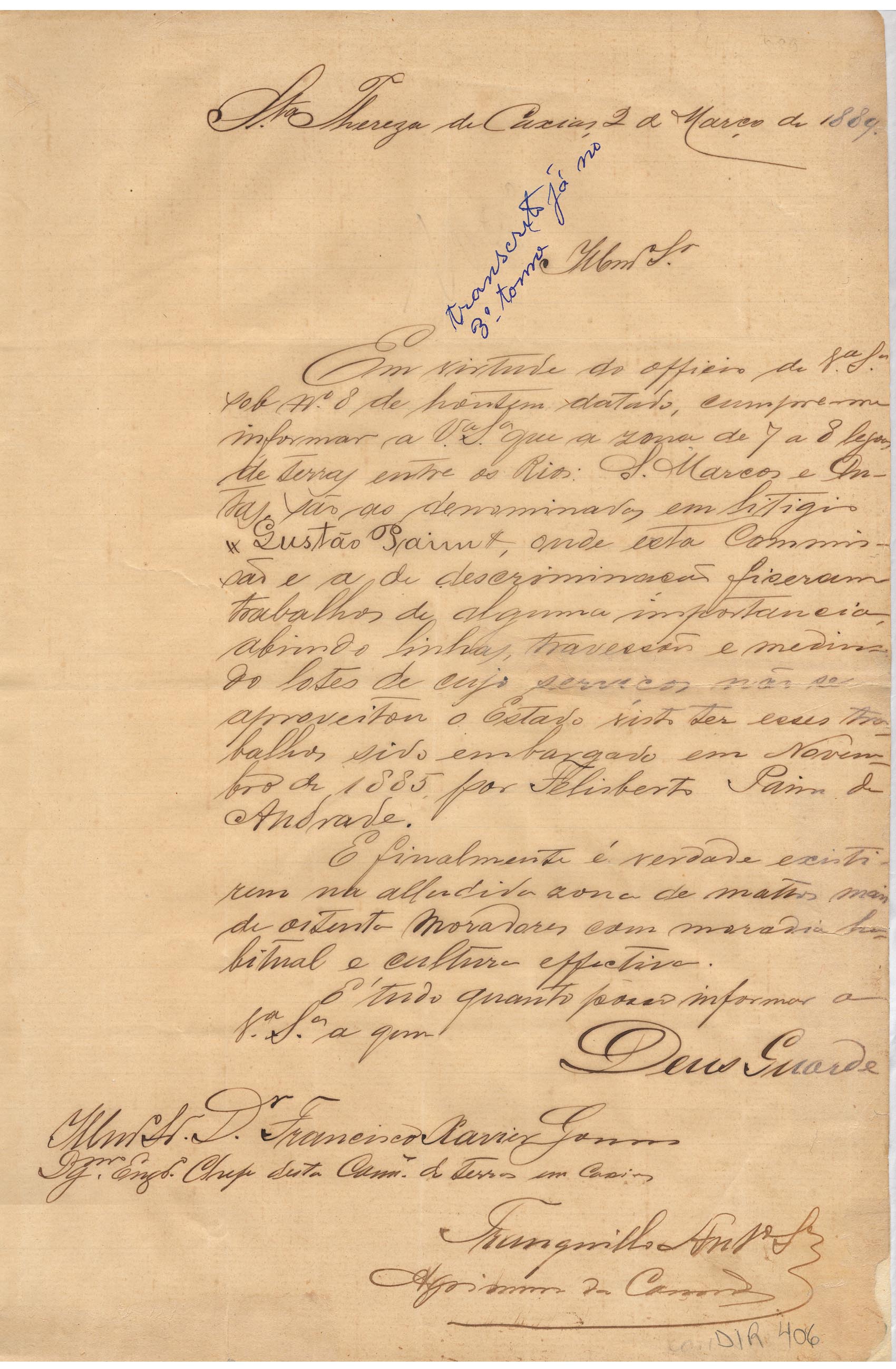 De Tranquillo Antônio da Silva - Agrimensor da Comissão de Medição de Terras em Santa Tereza de Caxias, para Francisco Xavier Gomes - Engenheiro Chefe da mesma Comissão. Assunto: informa que as terras entre os Rios São Marcos e Antas (7 a 8 léguas) encontram-se em litígio - Gustão Paim - local em que a Comissão realizou trabalhos. DIR 406