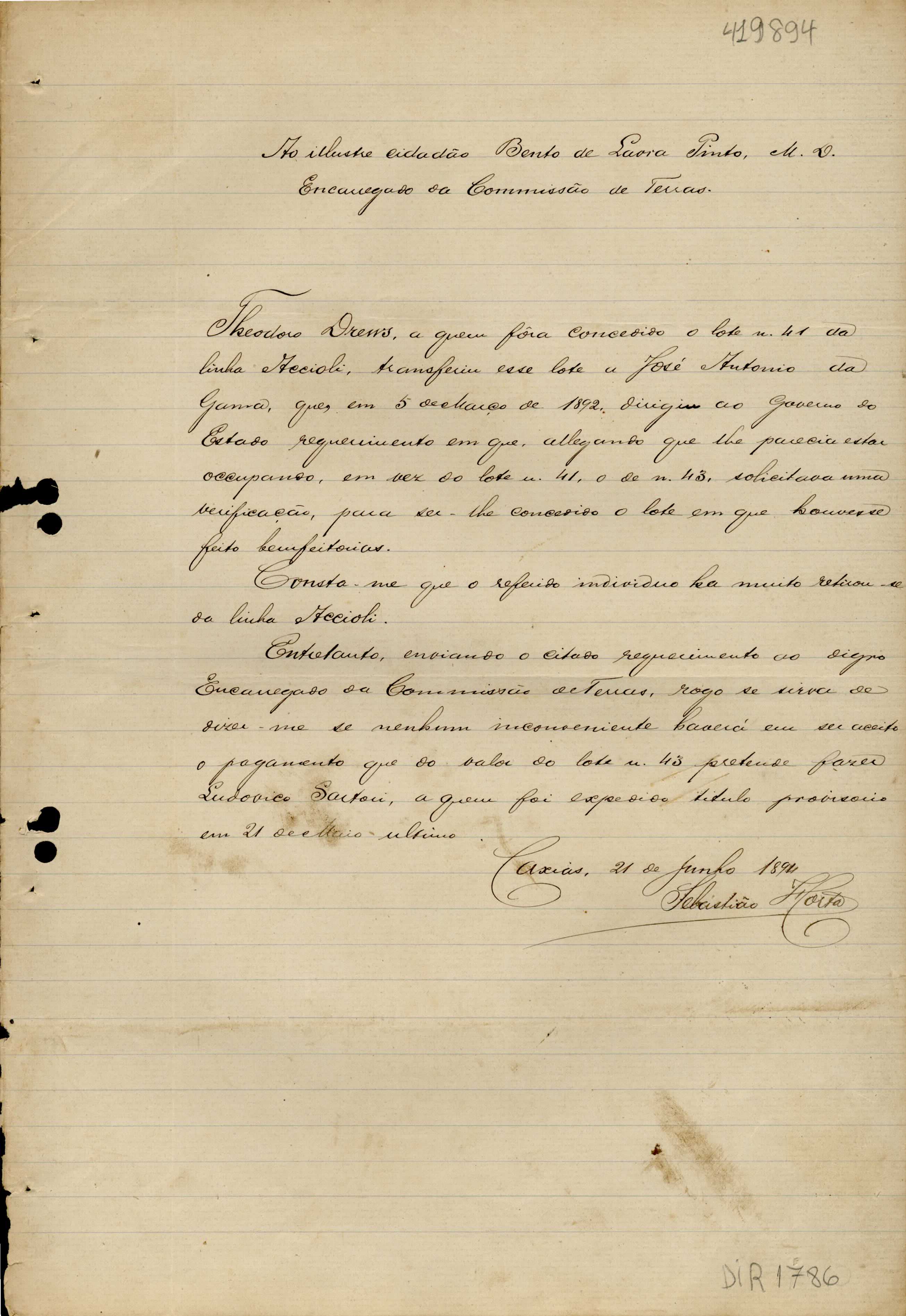 De Sebastião Horta - Comissão do Governo do Estado - Caxias, para Bento de Lavra Pinto - Encarregado dos serviços da Comissão de Terras. Assunto: informações sobre Theodoro Drews e José Antonio da Gama, concessionários do lote nº 41 ou 43 da linha Accioli; envio do requerimento de Ludovico Sartori, sobre pagamento do lote nº 43.