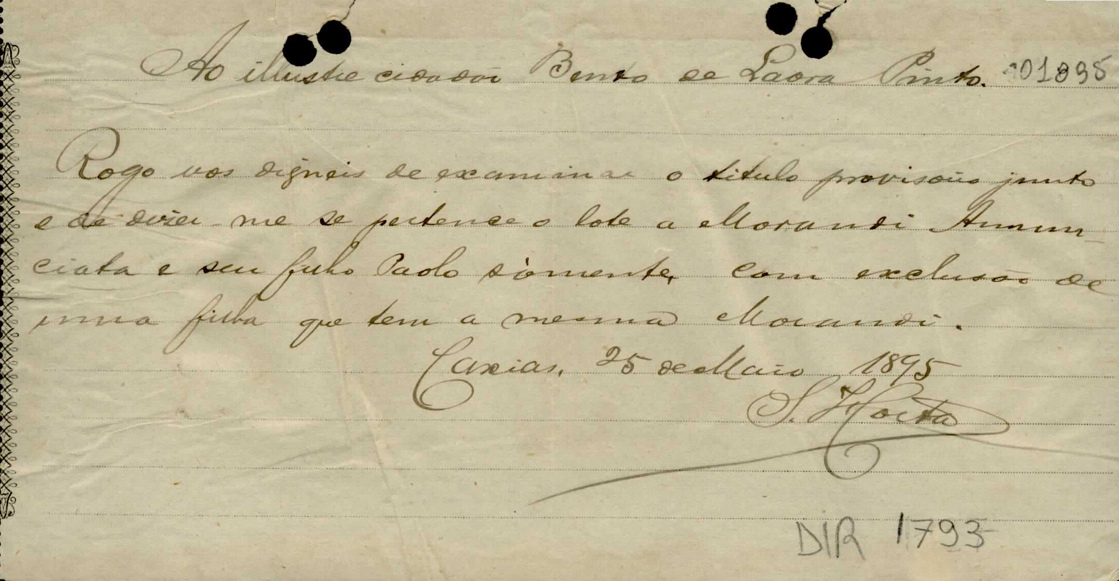 De Sebastião Horta - Comissão do Governo do Estado, Caxias, para Bento de Lavra Pinto - Encarregado dos serviços da Comissão de Terras. Assunto: solicita informações relativas ao título provisório enviado: quer saber se o lote pertence ou não a Morandi Annunciata e seu filho Paolo, com exclusão de sua filha.