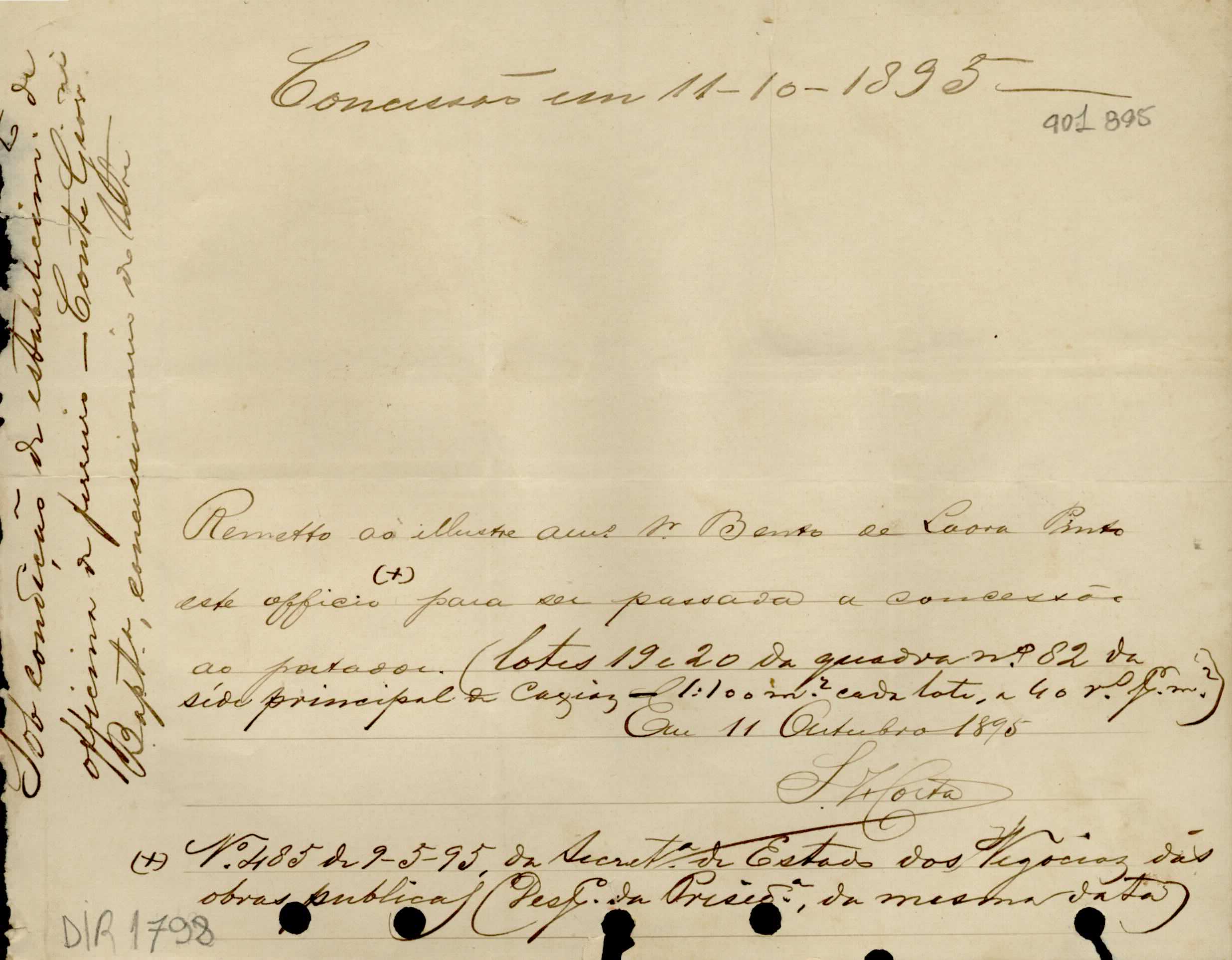 De Sebastião Horta - Comissão do Governo do Estado - Caxias, para Bento de Lavra Pinto - Encarregado dos serviços da Comissão de Terras. Assunto: comunica envio de ofício para passar concessão a Conte Giovanni Batista.