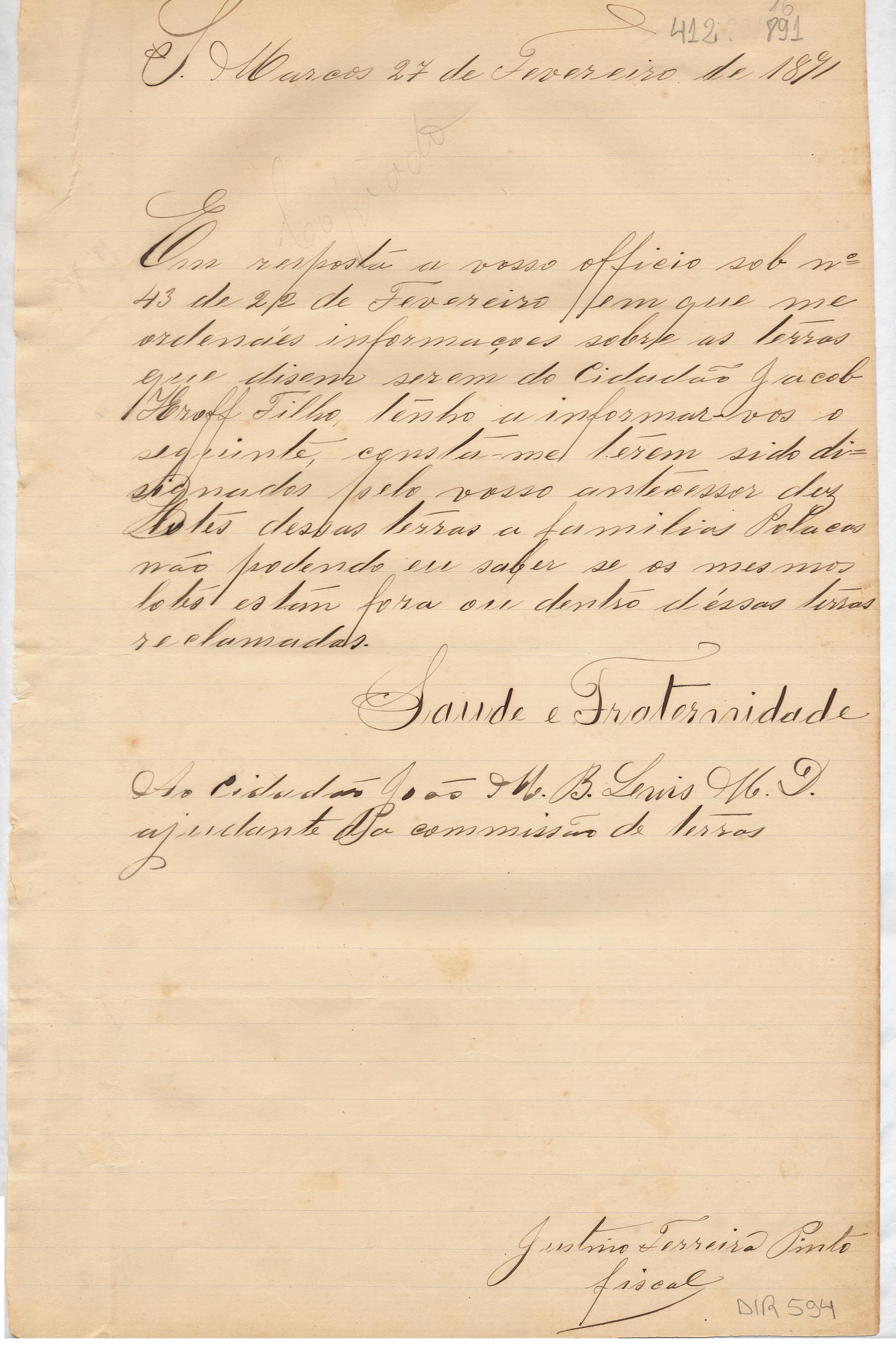 De Justino Ferreira Pinto - Fiscal da Comissão em São Marcos, para João Manoel Barreto Lewis - Ajudante da Comissão de Terras das colônias Alfredo Chaves e Antonio Prado. Assunto: informa que dez lotes das terras de Jacob Heroff Filho foram designados à famílias polacas.