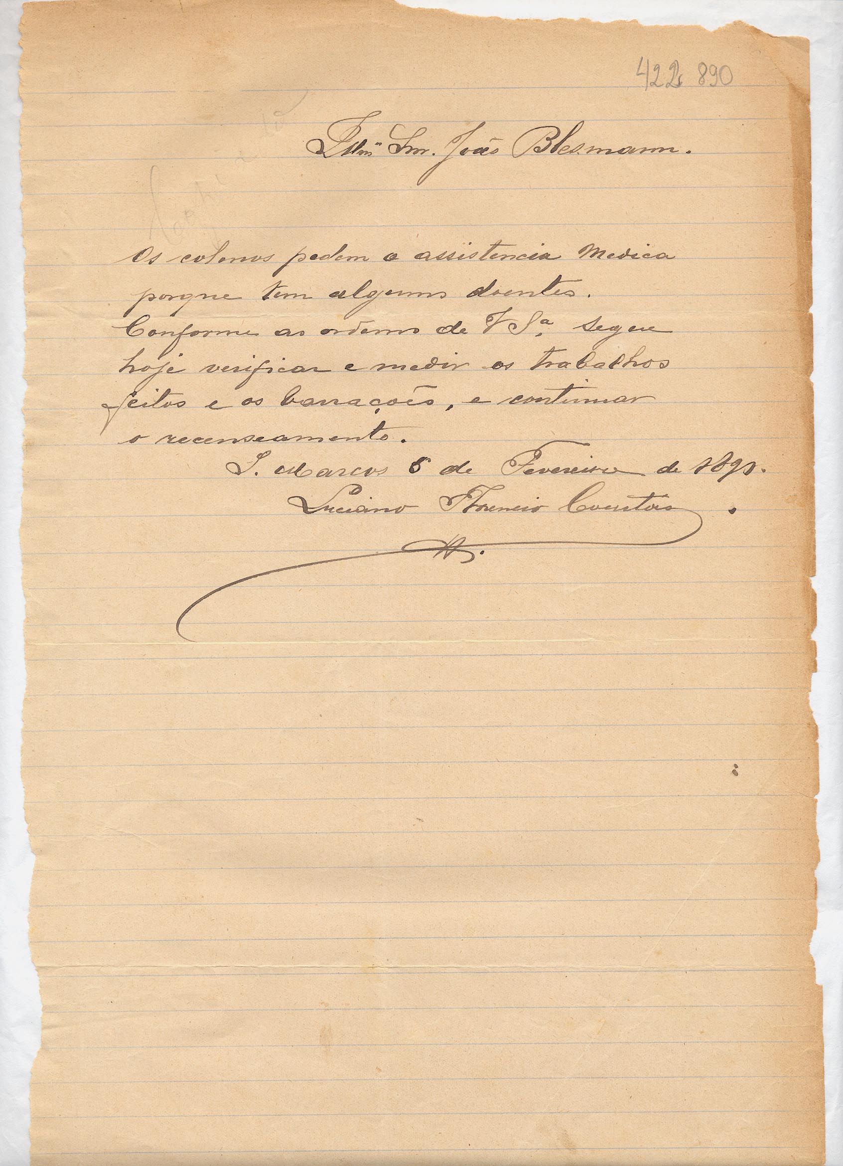 "De Luciano Florencio Courtois - Fiscal da Comissão em São Marcos, para João Blessmann - Ajudante da Comissão. Assunto: comunica que os colonos solicitam assistência médica; informa que será realizada medição e verificação dos trabalhos."