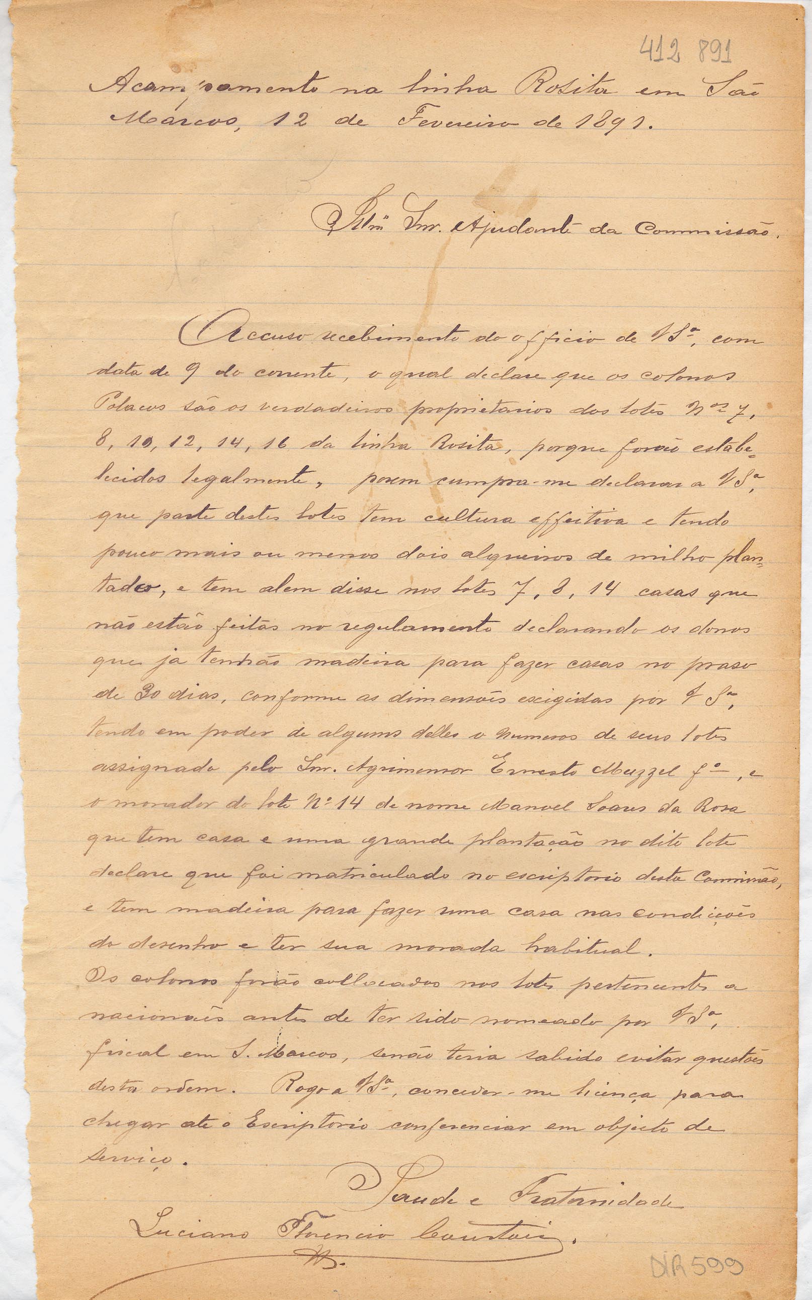 De Luciano Florencio Courtois - Fiscal da Comissão em São Marcos, para João Blessmann - Ajudante da Comissão. Assunto: comunica recebimento de ofício declarando que os colonos polacos são os verdadeiros proprietários dos lotes nos 7, 8, 10, 12, 14, 16, da Linha Rosita.