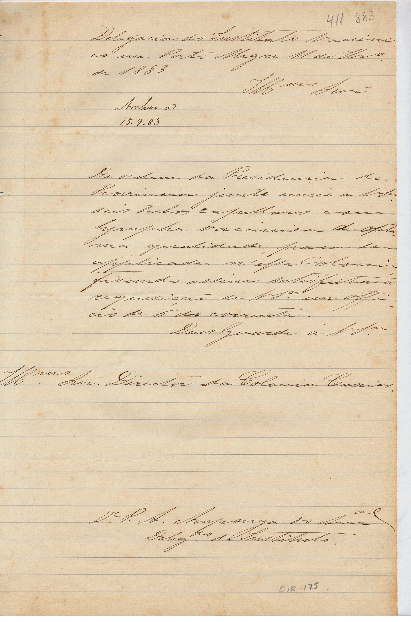 Da Delegacia do Instituto Vacínico - Porto Alegre - Araponga (?) - Delegado do Instituto, para o Diretor da Colônia Caxias. Assunto: comunica envio, por ordem da Presidência da Província, de seis tubos capilares com "limpha vacínica", para ser aplicada na colônia, conforme foi requerido. Local: Porto Alegre