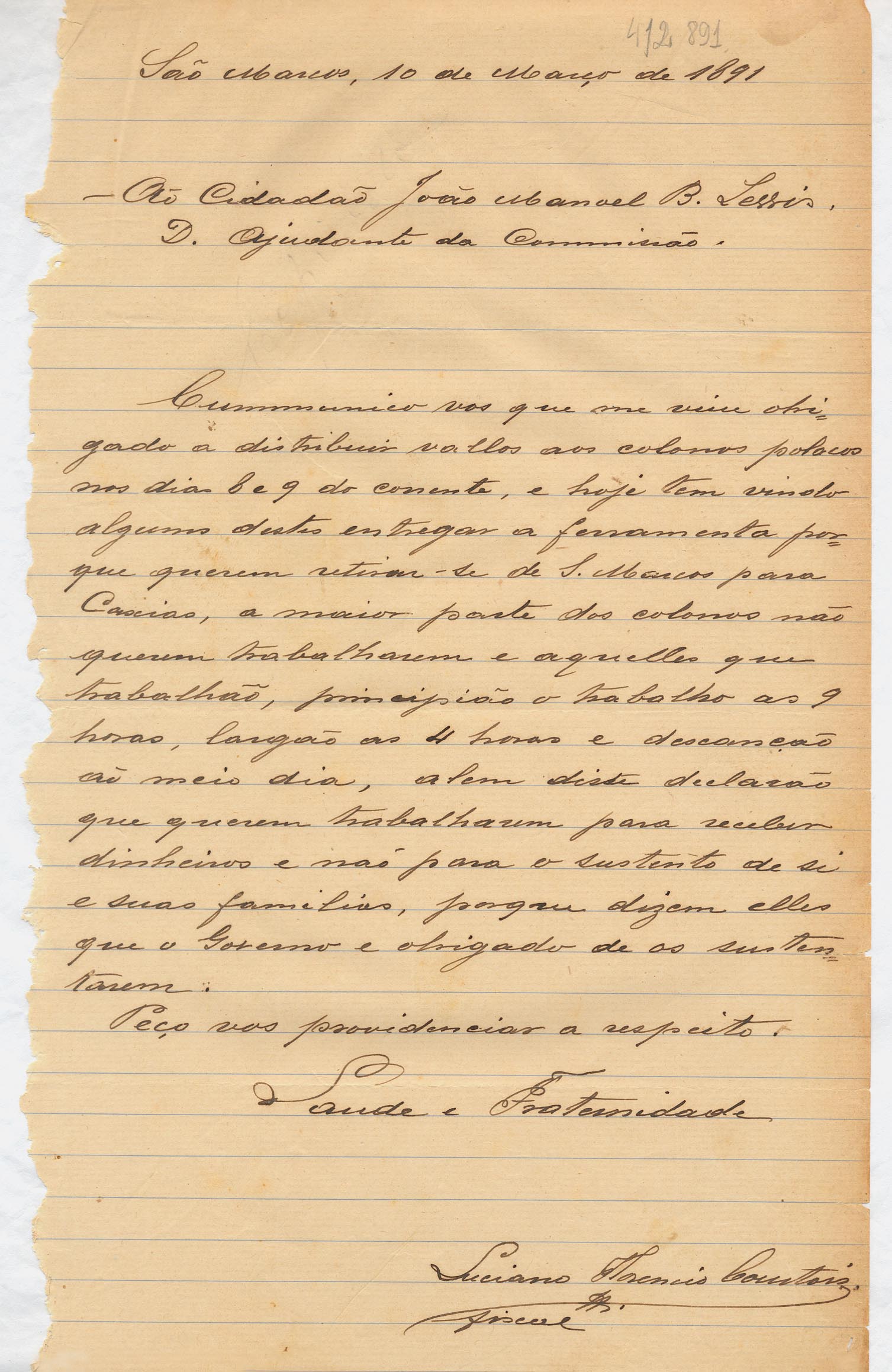 "De Luciano Florencio Courtois - Fiscal da Comissão em São Marcos, para João Manoel B. Lewis - Ajudante da Comissão. Assunto: comunica a distribuição de vales aos colonos polacos nos dias 8 e 9; reclama que eles não trabalham."