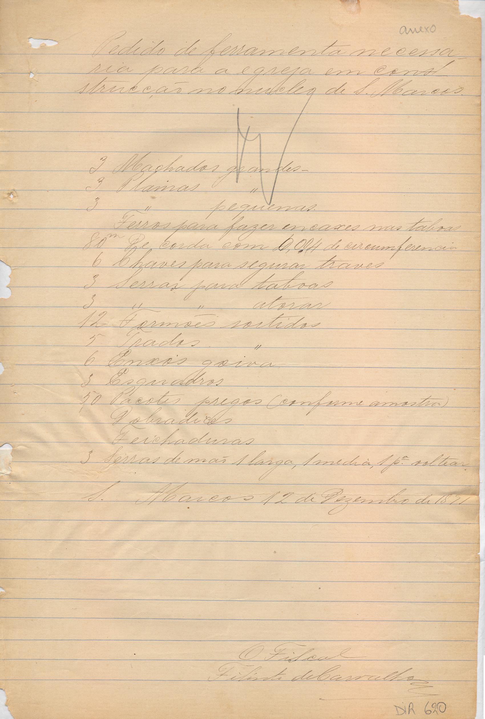 De Filinto de Carvalho - Fiscal da Comissão em São Marcos. Assunto: pedido de ferramentas necessárias para a construção da Igreja no núcleo de São Marcos.