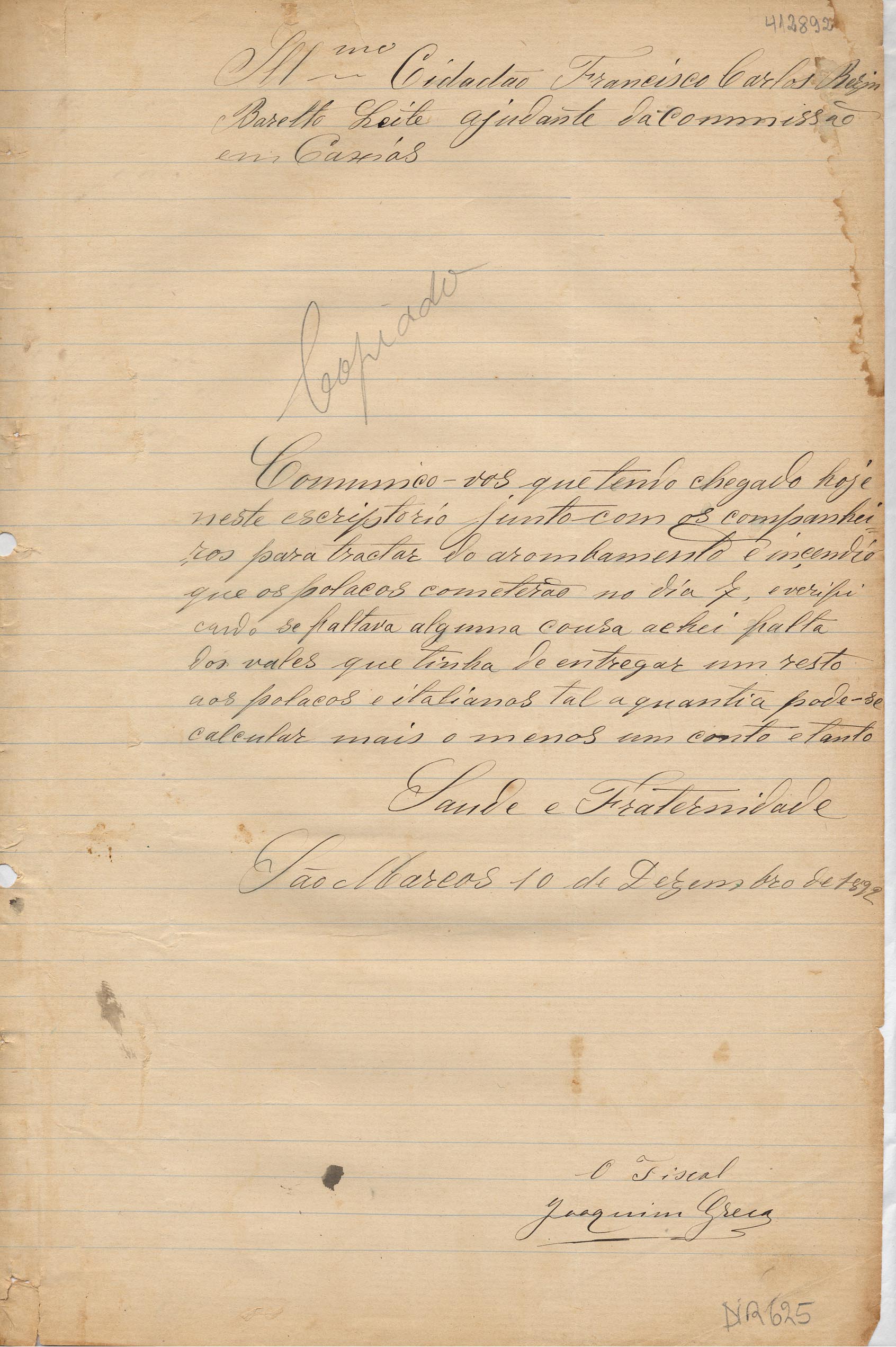 De Joaquim Greca - Fiscal da Comissão de Terras em São Marcos, para Francisco Carlos Resin Barreto Leite - Ajudante da Comissão em Caxias. Assunto: comunica que após o arrombamento e incêndio cometidos pelos polacos, achou falta dos vales.