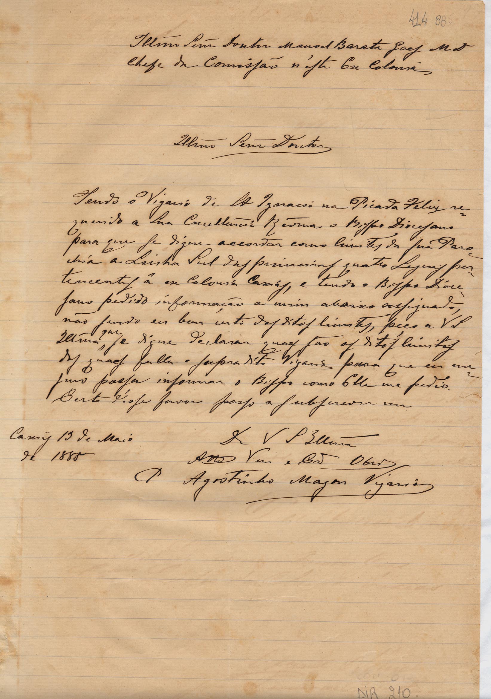 De P. Agostinho Magon - Vigário, para Manoel Barata Góes - Engenheiro chefe da Comissão de Terras de Caxias. Assunto: definição dos limites da Paróquia da ex-colônia Caxias. Local: Colônia Caxias.