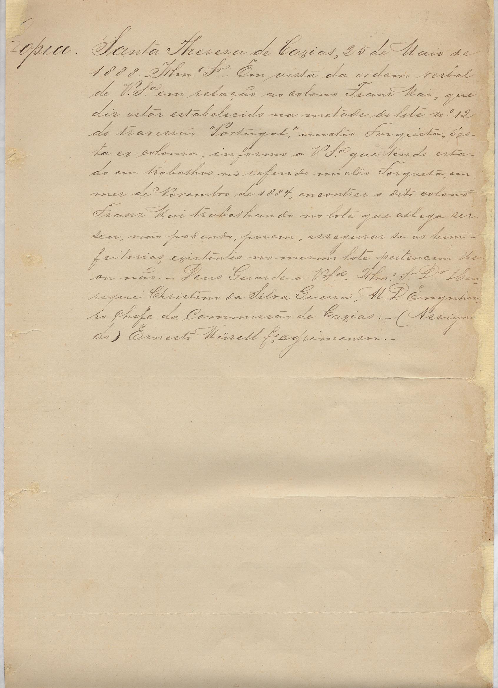 De Ernesto Müzzell Filho - Agrimensor, para Henrique Christino da Silva Guerra - Engenheiro chefe da Comissão de Caxias. Assunto: cópia da carta anterior: BR RS APMCS DIR-C-02-225. Local: ex-colônia Caxias.