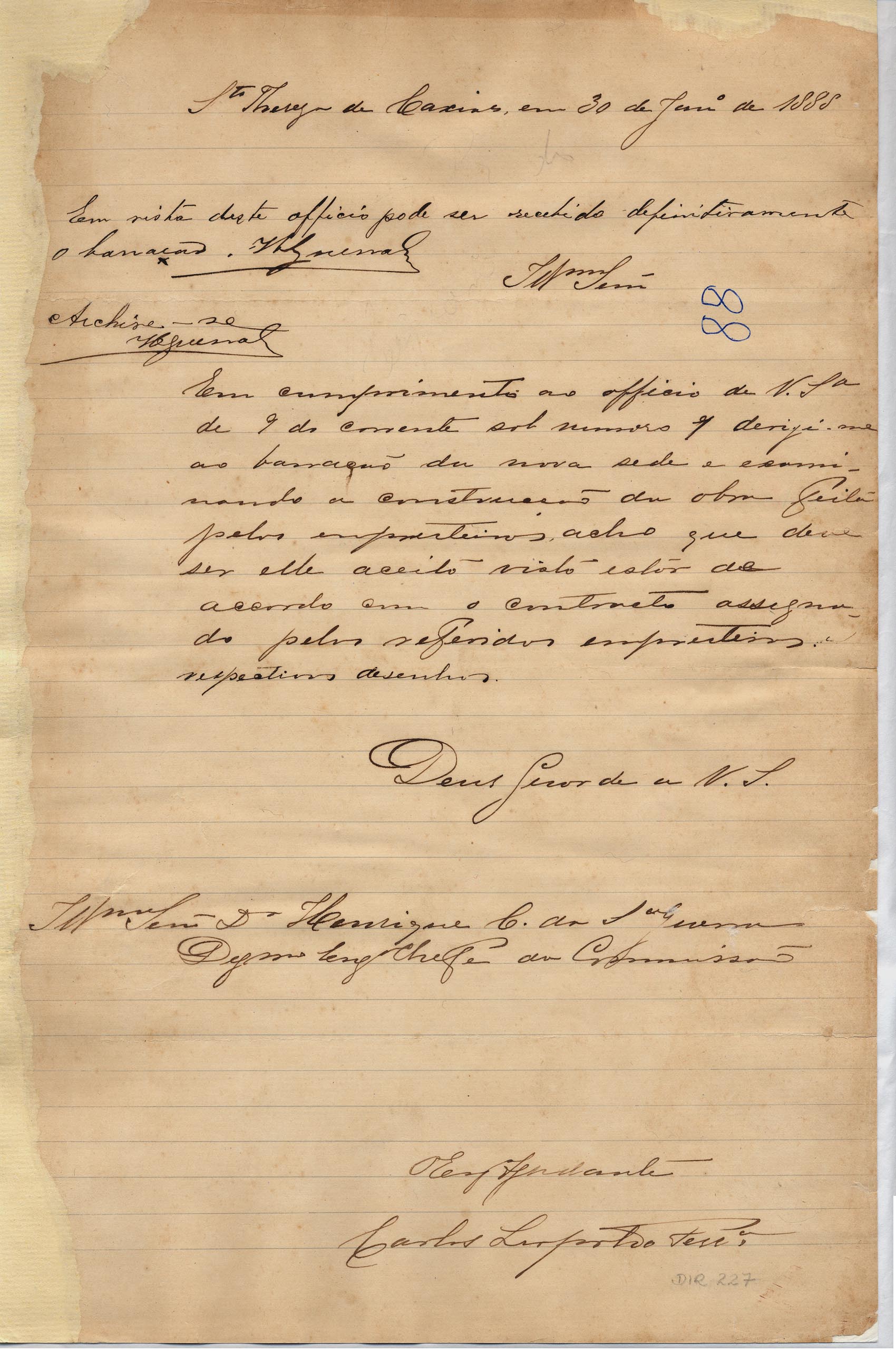 De Carlos Leopoldo Ferreira - Engenheiro ajudante da Comissão, para Henrique Christino da Silva Guerra - Engenheiro chefe da Comissão. Assunto: informa que o barracão da nova sede, que se encontra em construção, está de acordo com contrato. Local: ex-colônia Caxias.