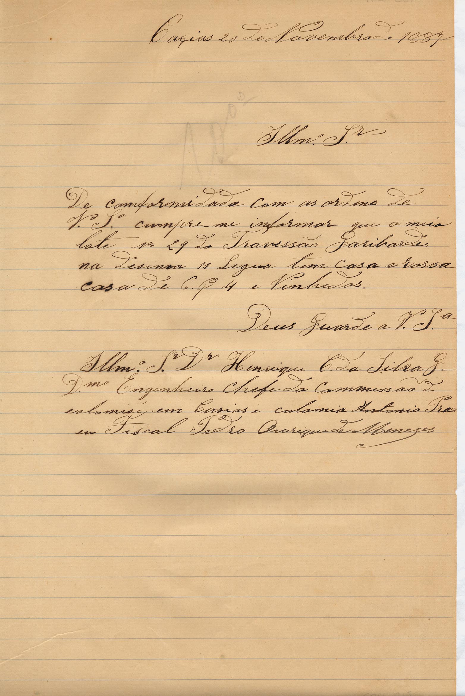 De Pedro Ourique de Menezes - Fiscal, para Henrique Christino da Silva Guerra - Engenheiro chefe da Comissão das Colônias Caxias e Antonio Prado. Assunto: informações sobre o lote nº 29 do travessão Garibaldi, 11ª Légua.