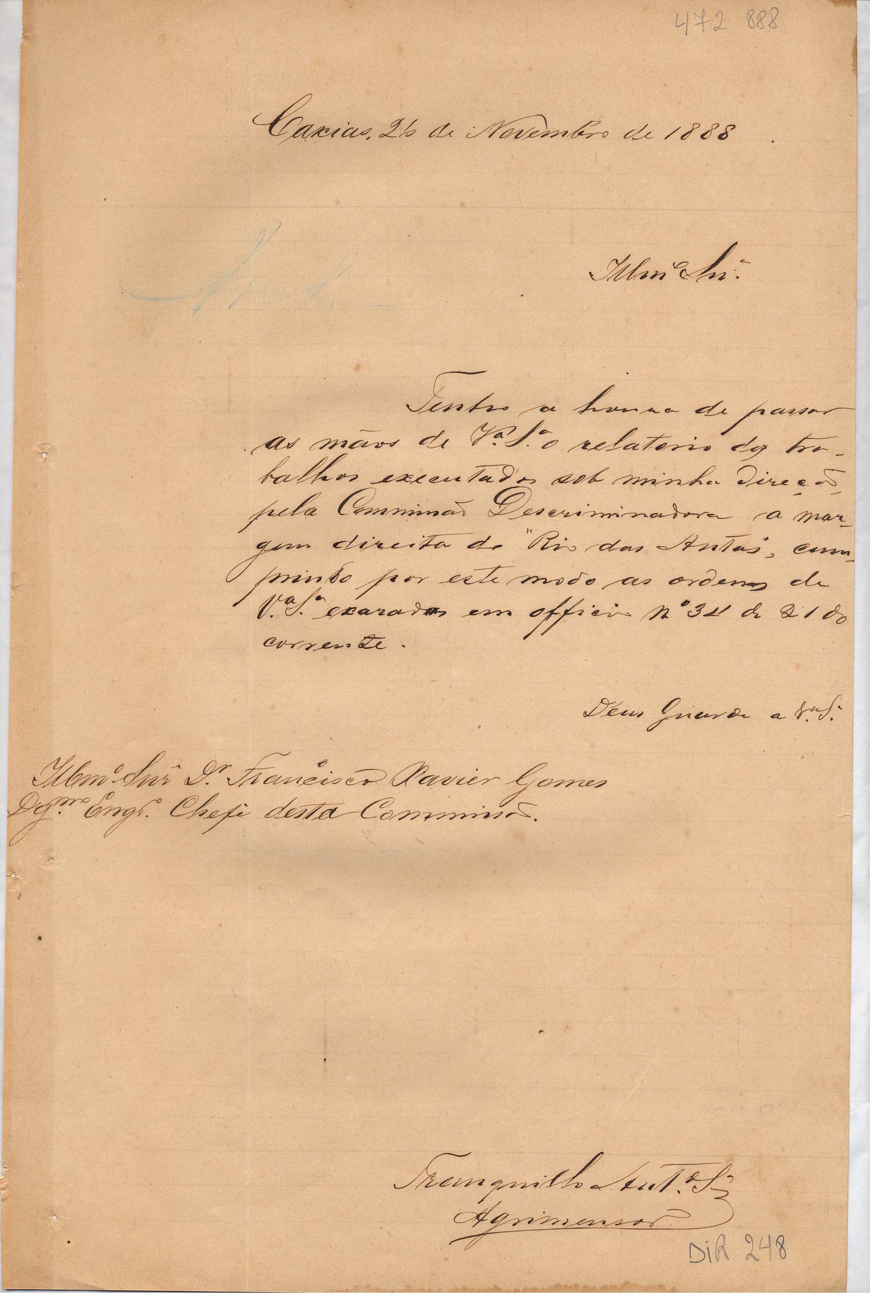 De Tranquillo Antonio Silva - Agrimensor, para Francisco Xavier Gomes - Engenheiro chefe da Comissão. Assunto: comunica envio de relatório dos trabalhos executados na margem direita do Rio das Antas.