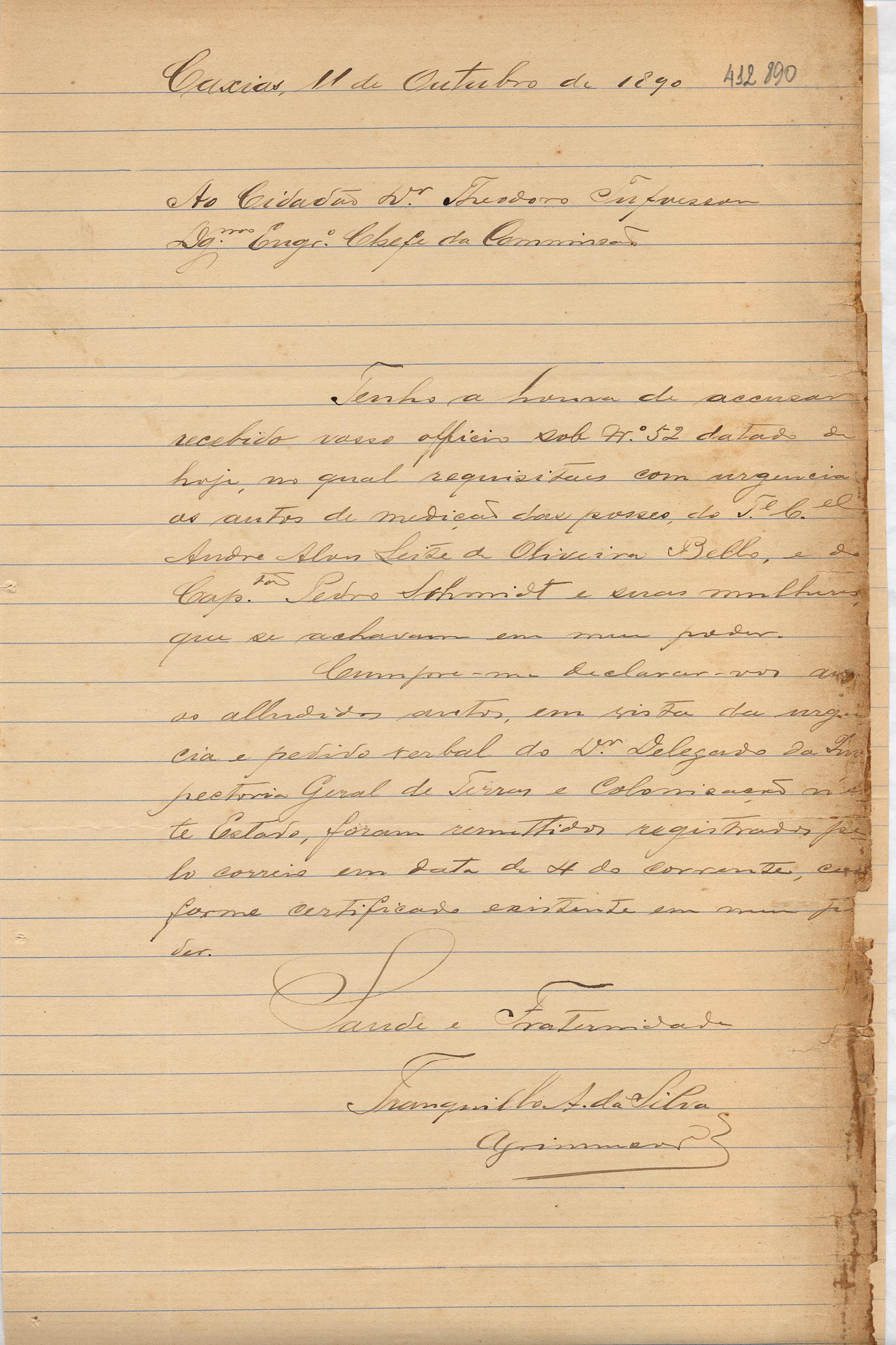 "De Tranquillo A. Silva - Agrimensor da Comissão, para Teodoro Tufvesson - Engenheiro chefe da Comissão. Assunto: acusa recebimento de ofício; declara envio dos autos de medição."