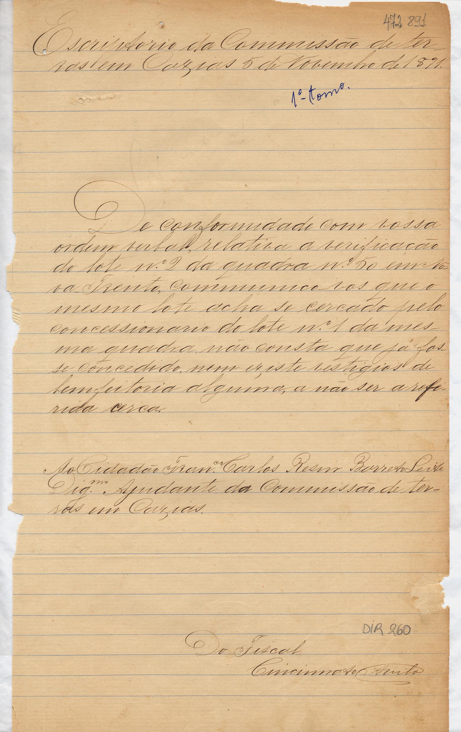 De Cincinnato Ávila - Fiscal da Comissão de Terras em Caxias, para Francisco Carlos Resin Barreto Leite - Ajudante da Comissão de Terras em Caxias. Assunto: informa sobre o lote nº 2, da quadra nº 50 em Nova Trento. Local: Caxias.