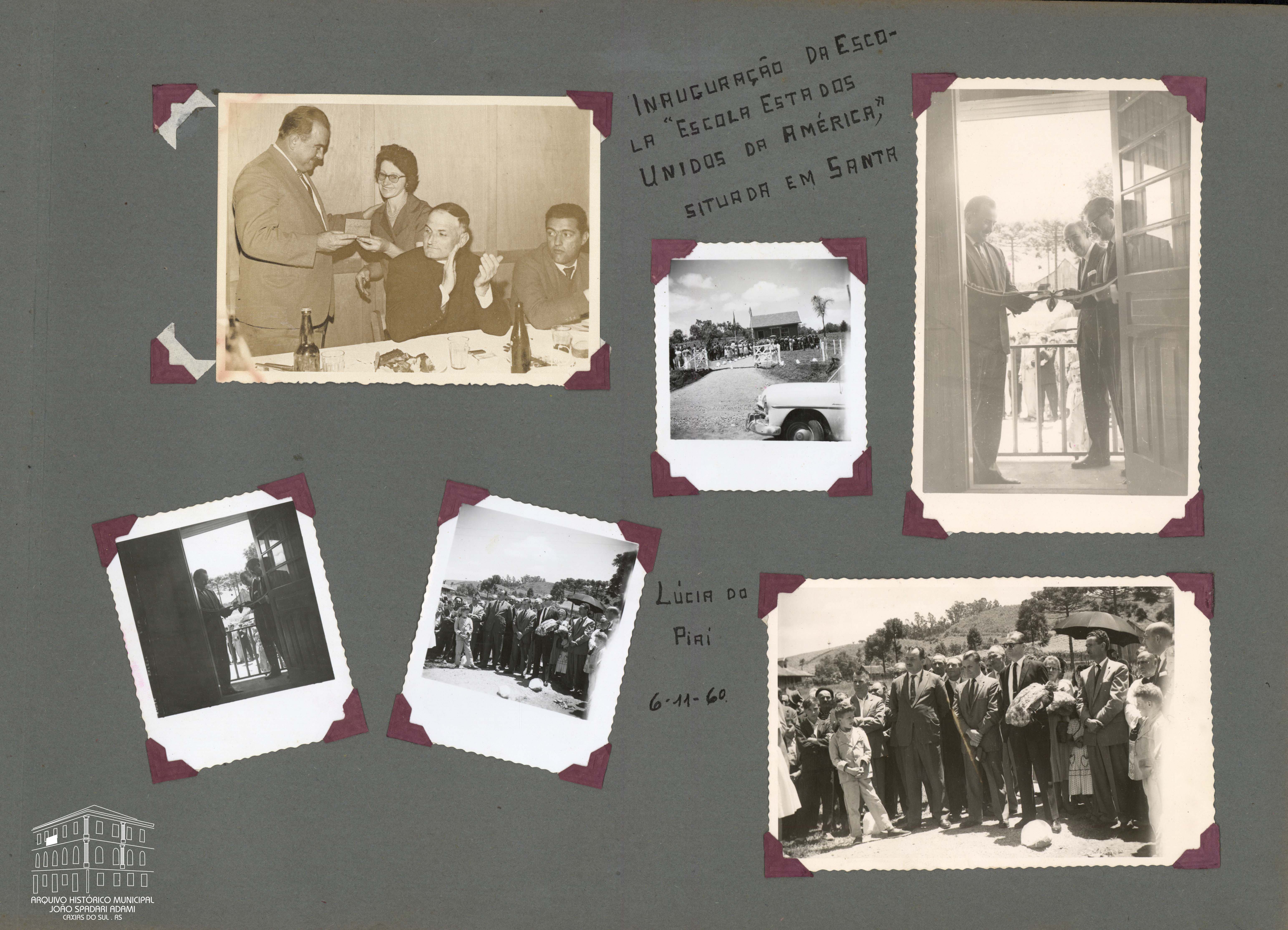 Foto 80: À esquerda, Prefeito Armando Alexandre Biasuz e, ao centro, Diretor da Instrução, Nestor José Gollo, descerrando a fita inaugural da Escola Estados Unidos da América, situada na Zona Scopel, Distrito de Santa Lúcia do Piaí, em 06 de novembro de 1960.