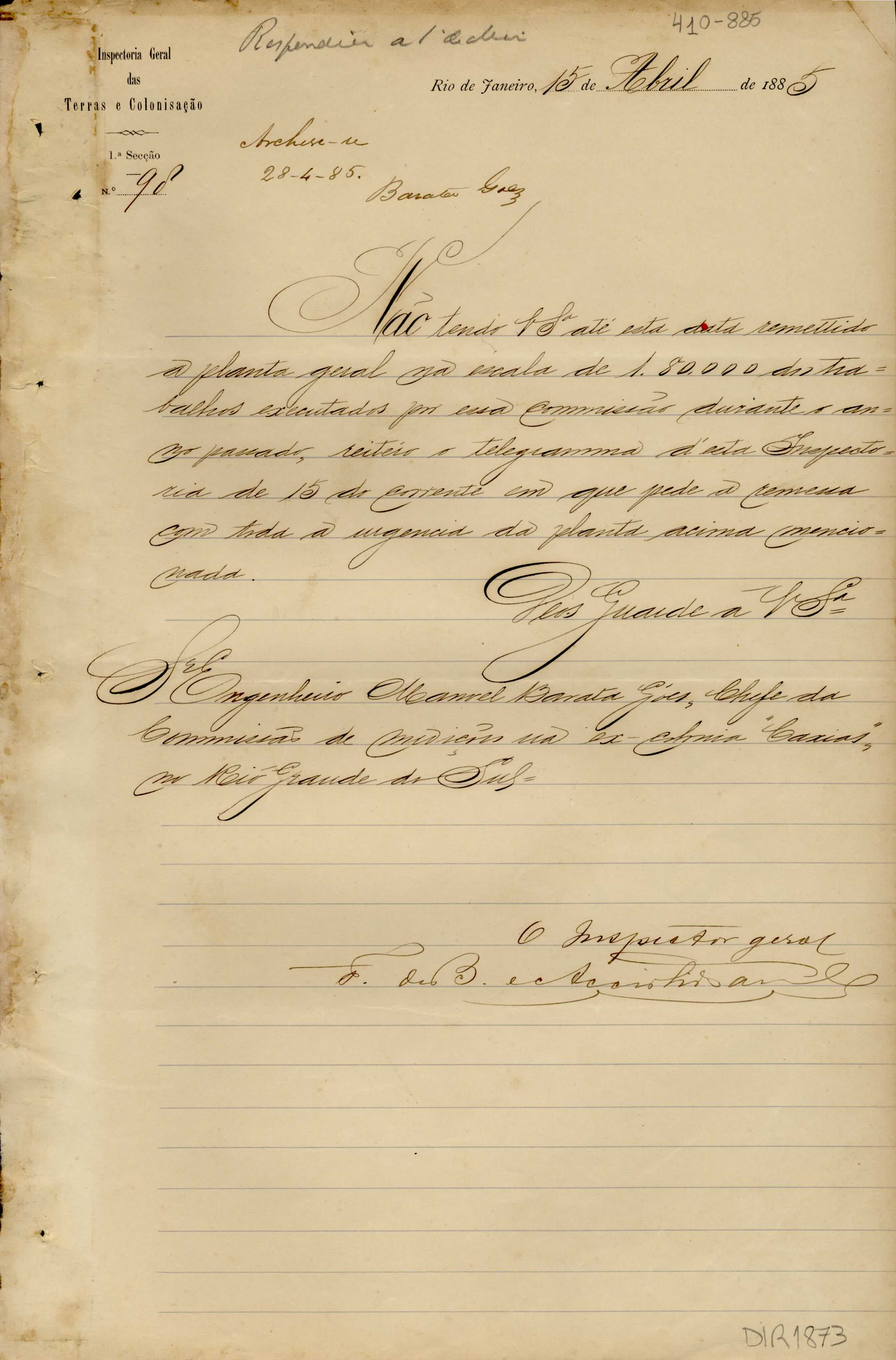 De Francisco de Barros e Accioli de Vasconcellos - Inspetor Geral das Terras e Colonização no RJ, para Manoel Barata Góes - Engenheiro Chefe de Medições na ex-Colônia Caxias. Assunto: solicita remessa de planta geral dos trabalhos executados pela Comissão.