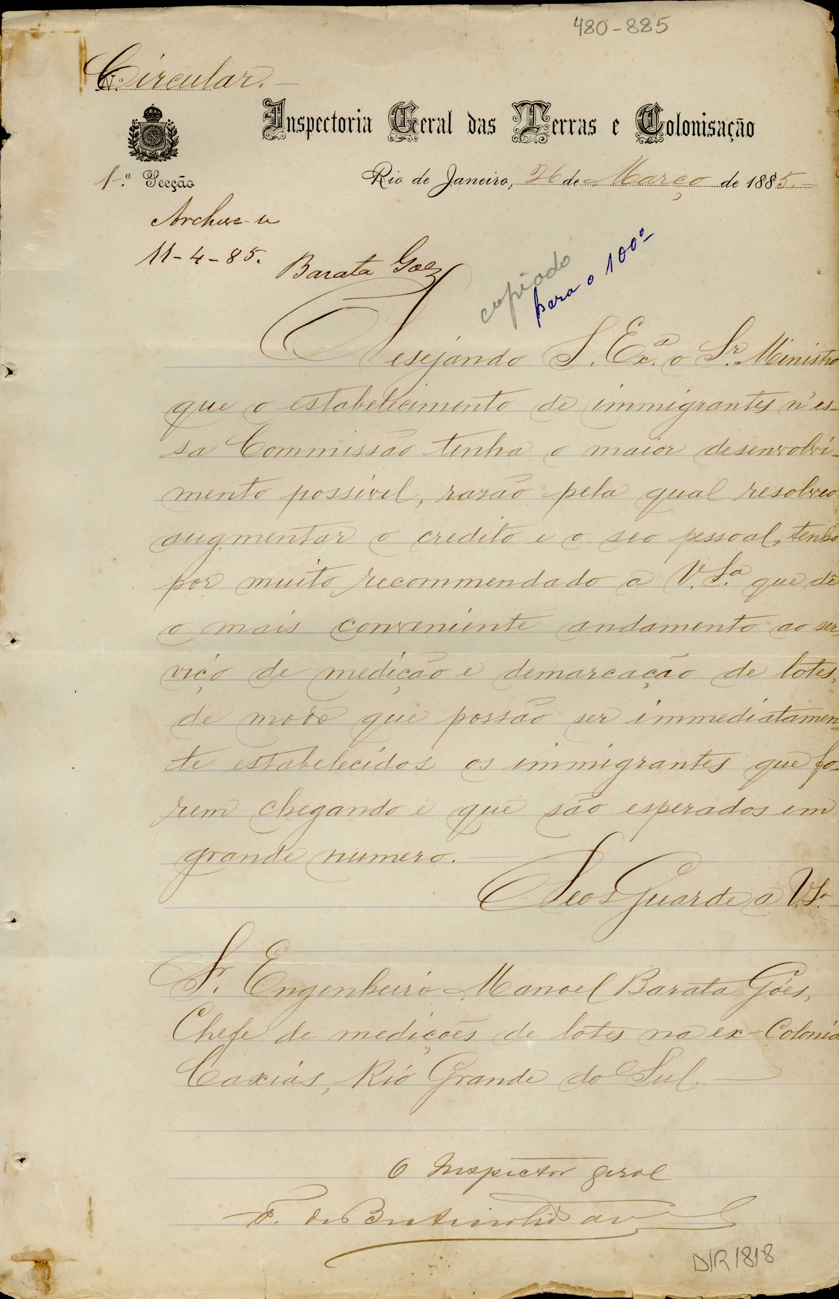 De Francisco de Barros e Accioli de Vasconcellos - Inspetor Geral das Terras e Colonização no Rio de Janeiro, para Manoel Barata Góes - Engenheiro Chefe de medições de lotes na ex-Colônia Caxias. Assunto: recomendação para dar andamento ao serviço de medição e demarcação de lotes, para o imediato estabelecimento de imigrantes.