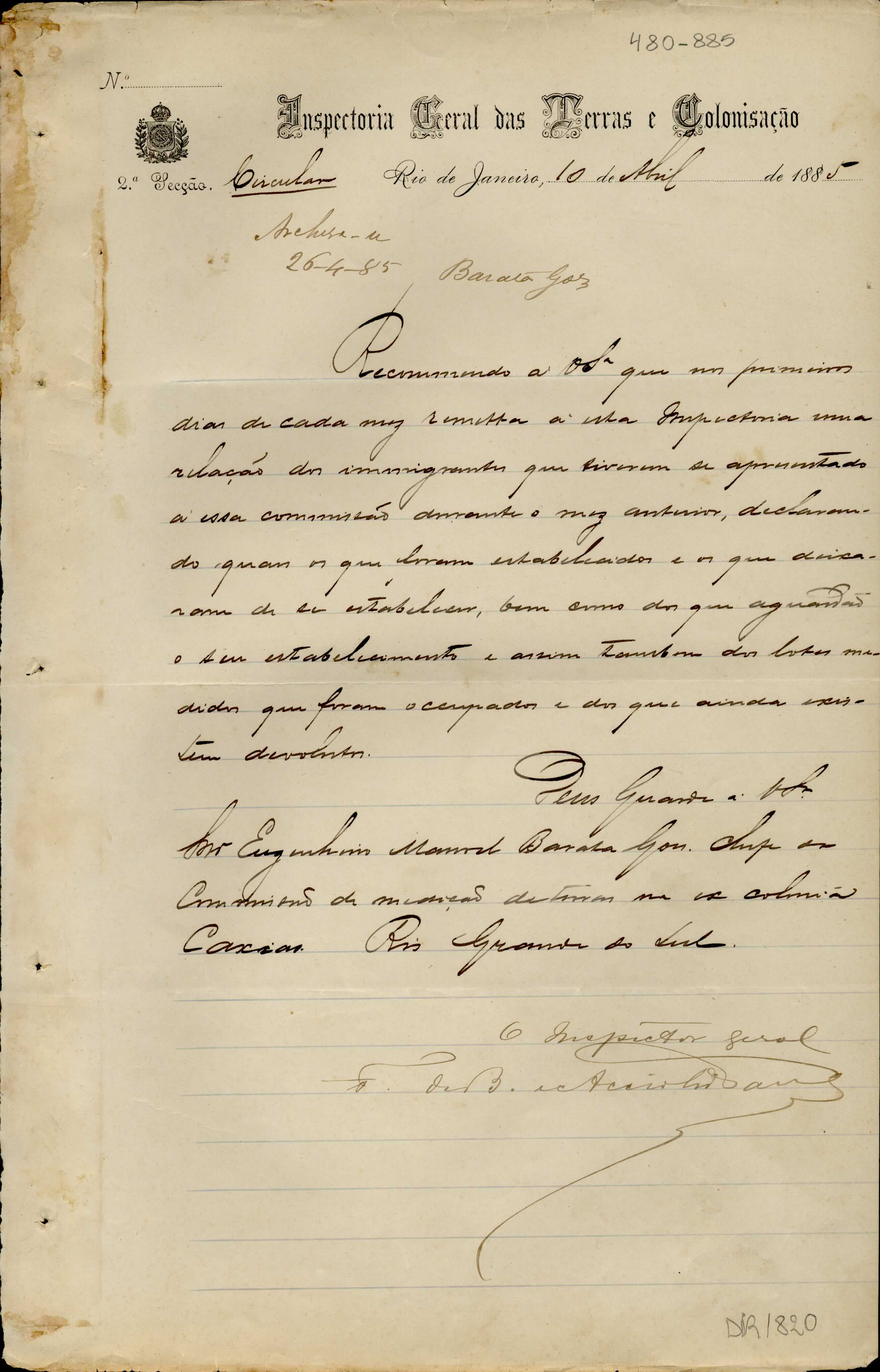 De Francisco de Barros e Accioli de Vasconcellos - Inspetor Geral das Terras e Colonização no Rio de Janeiro, para Manoel Barata Góes - Engenheiro Chefe de medições de lotes na ex-Colônia Caxias. Assunto: solicita remessa nos primeiros dias de cada mês, de uma relação dos imigrantes que se apresentaram à Comissão no mês anterior.