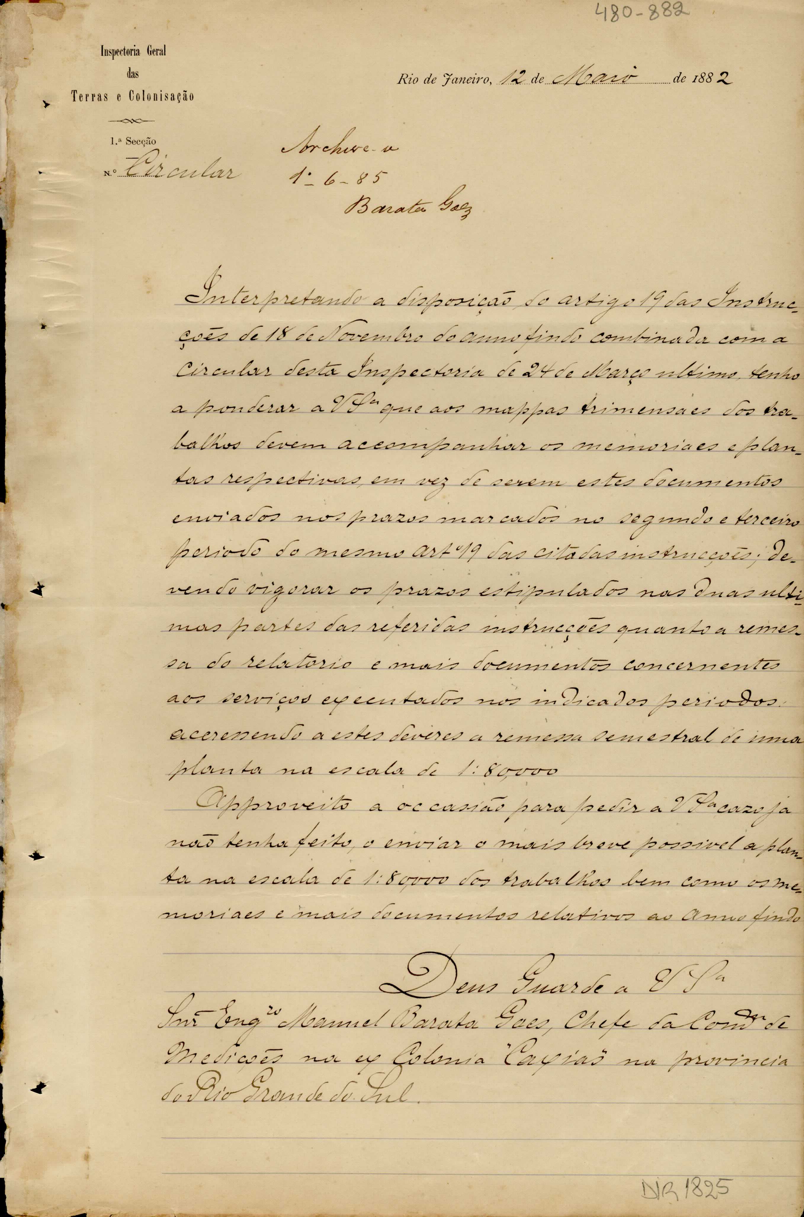 De Francisco de Barros e Accioli de Vasconcellos - Inspetor Geral das Terras e Colonização no Rio de Janeiro, para Manoel Barata Góes - Engenheiro Chefe de medições de lotes na ex-Colônia Caxias. Assunto: recomenda que os mapas trimensais dos trabalhos acompanhem os memoriais e plantas respectivas; devem vigorar os prazos estipulados nas instruções.