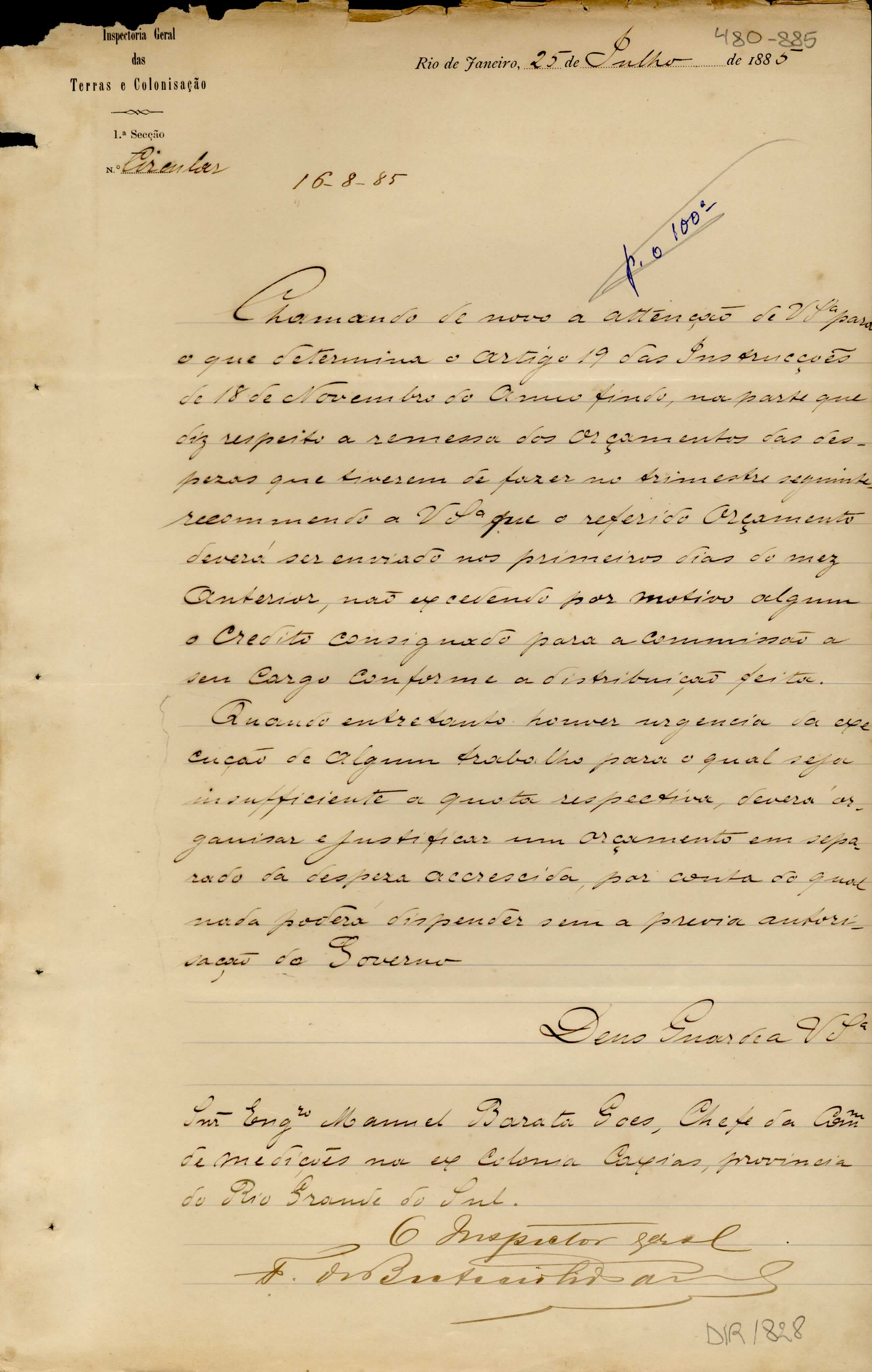 De Francisco de Barros e Accioli de Vasconcellos - Inspetor Geral das Terras e Colonização no Rio de Janeiro, para Manoel Barata Góes - Engenheiro Chefe de medições de lotes na ex-Colônia Caxias. Assunto: recomenda a remessa dos orçamentos das despesas trimestrais nos primeiros dias do mês anterior.