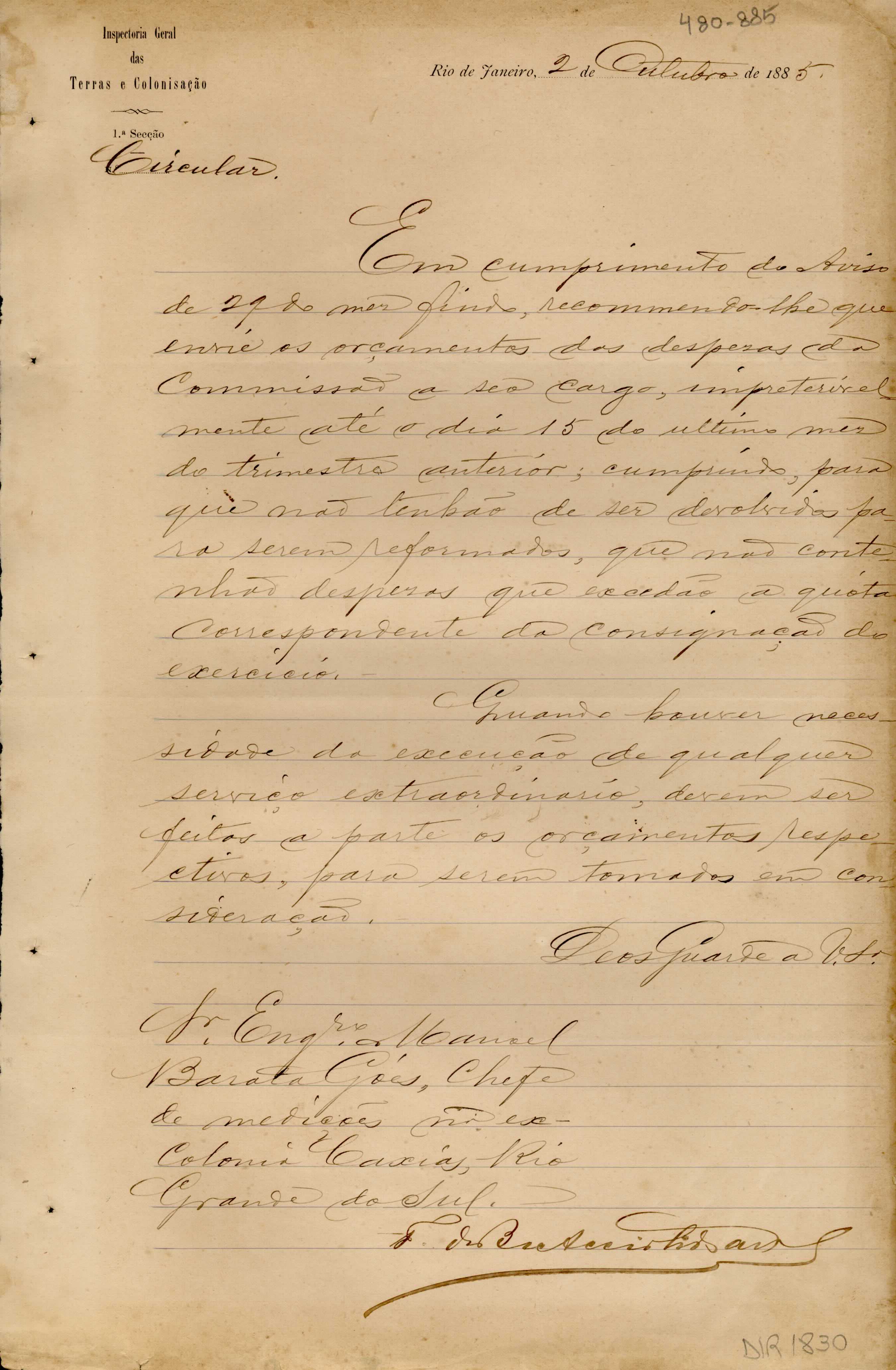 De Francisco de Barros e Accioli de Vasconcellos - Inspetor Geral das Terras e Colonização no Rio de Janeiro, para Manoel Barata Góes - Engenheiro Chefe de medições de lotes na ex-Colônia Caxias. Assunto: recomenda envio dos orçamentos das despesas da Comissão até o dia 15 do último mês do trimestre anterior.