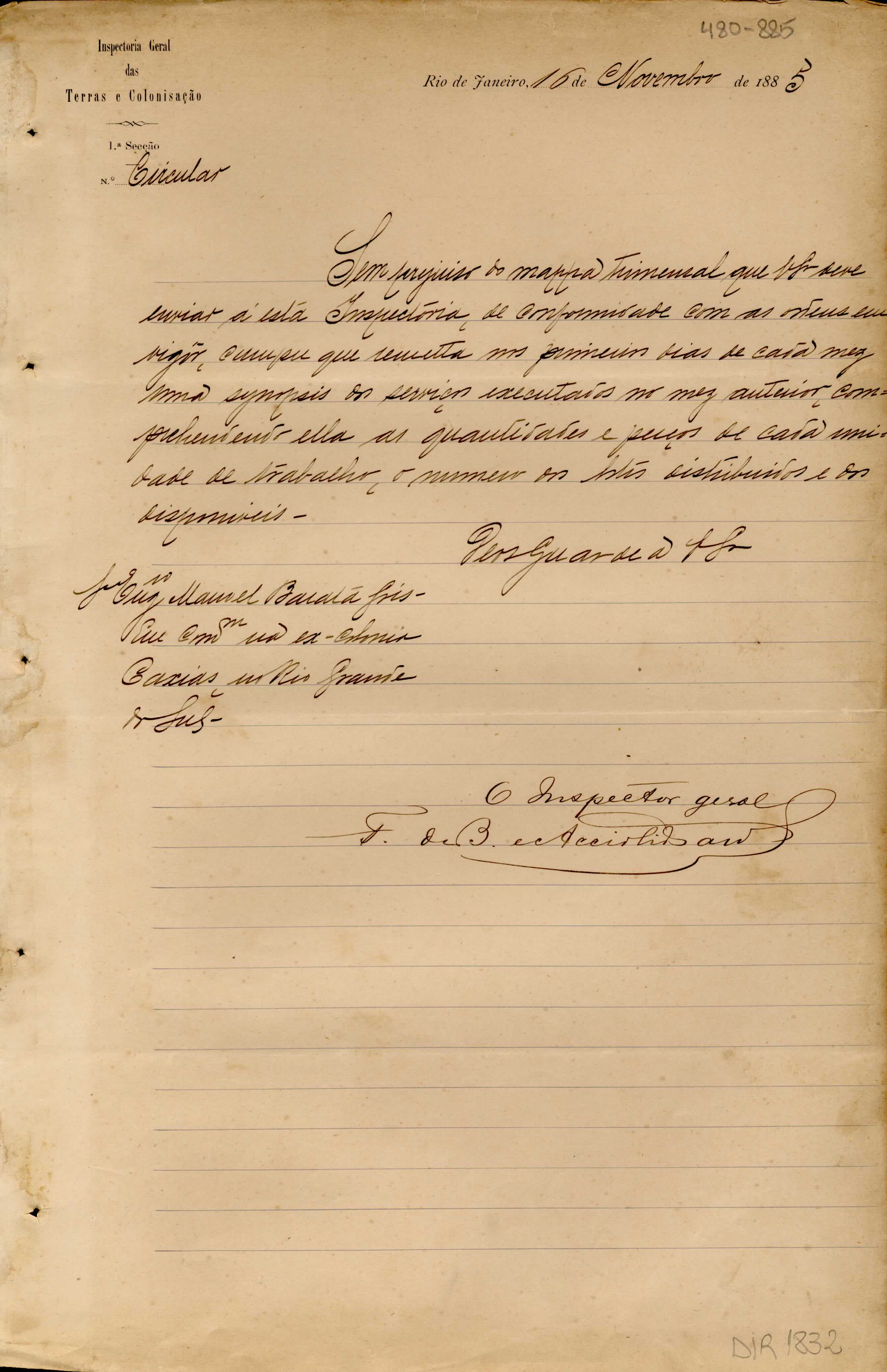 De Francisco de Barros e Accioli de Vasconcellos - Inspetor Geral das Terras e Colonização no Rio de Janeiro, para Manoel Barata Góes - Engenheiro Chefe de medições de lotes na ex-Colônia Caxias. Assunto: solicita a remessa nos primeiros dias de cada mês, de uma sinopse dos serviços executados no mês anterior.