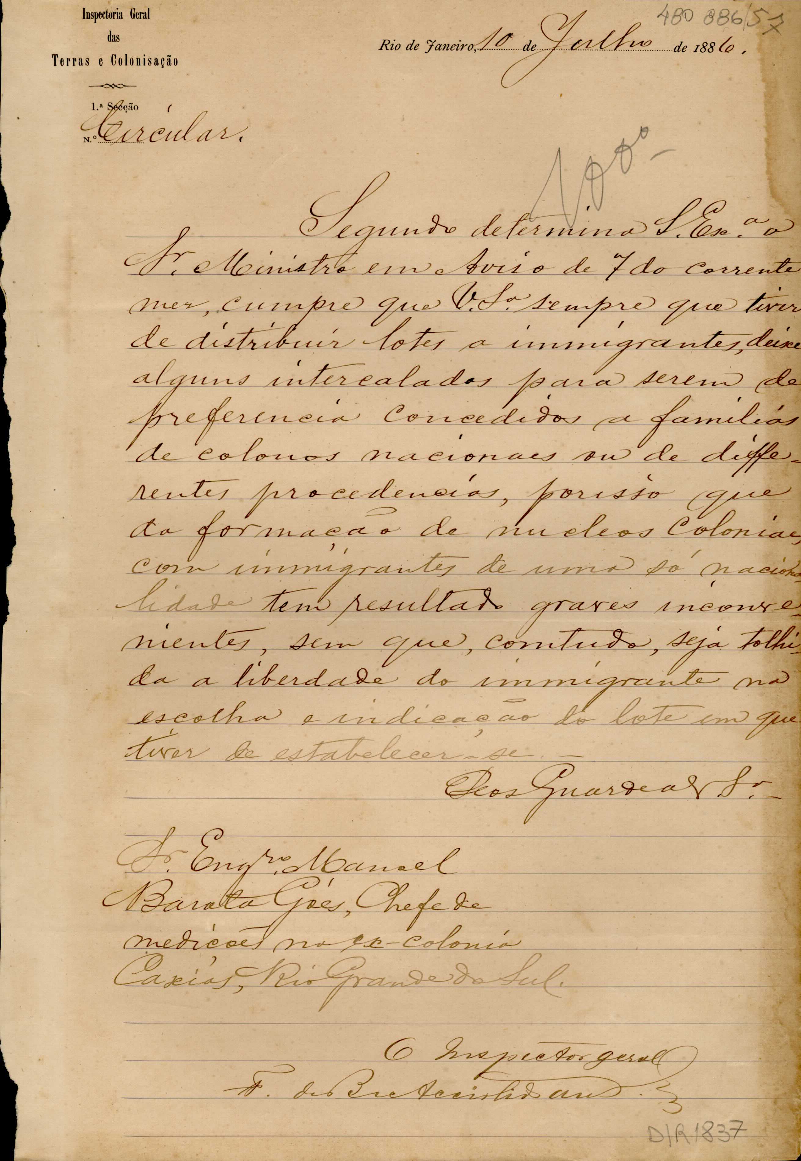 De Francisco de Barros e Accioli de Vasconcellos - Inspetor Geral das Terras e Colonização no Rio de Janeiro, para Manoel Barata Góes - Engenheiro Chefe de medições de lotes na ex-Colônia Caxias. Assunto: instruções para deixar alguns lotes intercalados, para serem distribuídos a colonos nacionais ou de diferentes procedências, quando distribuir lotes.