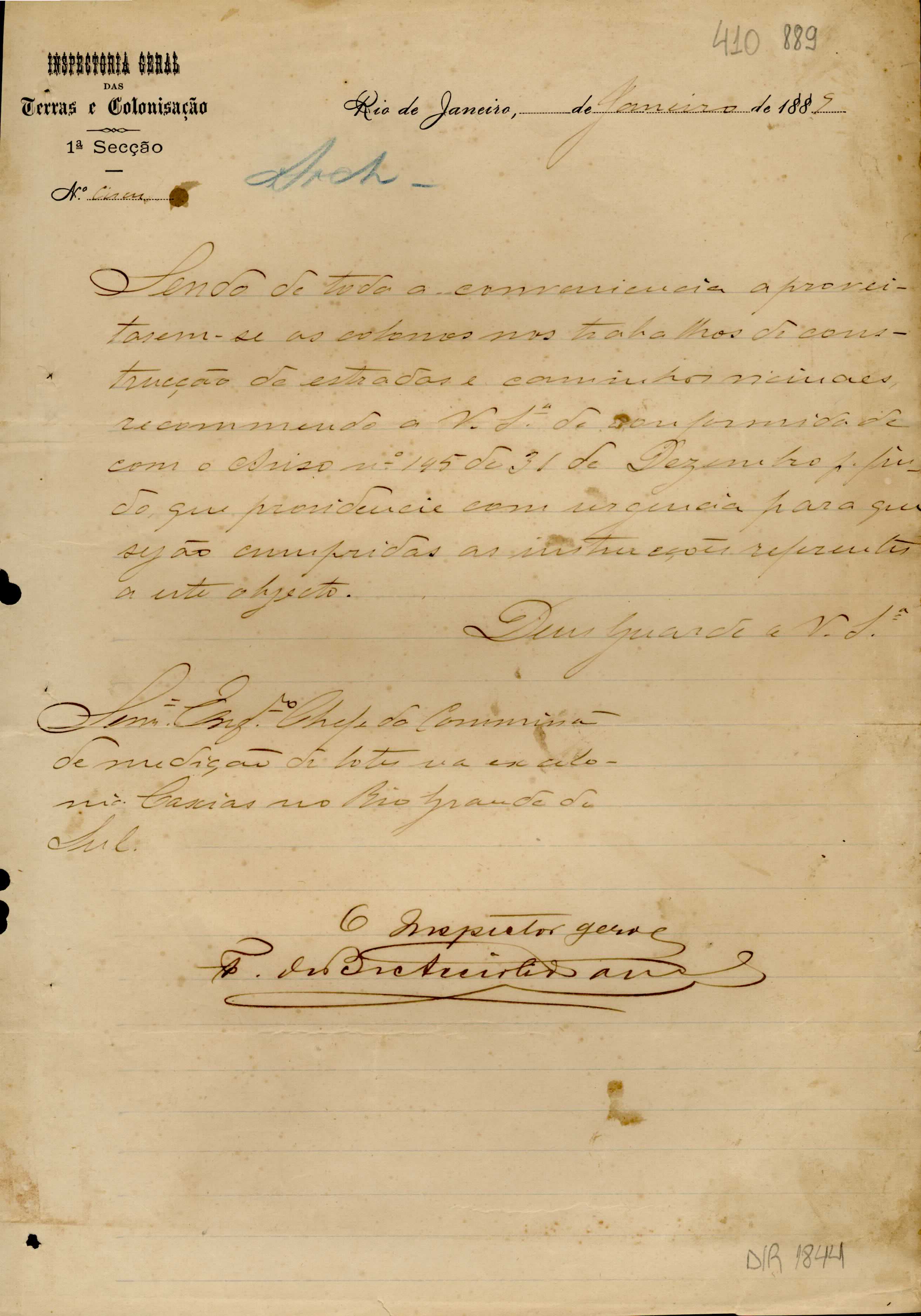 De Francisco de Barros e Accioli de Vasconcellos - Inspetor Geral das Terras e Colonização no Rio de Janeiro, para o Engenheiro Chefe de medições de lotes na ex-Colônia Caxias. Assunto: recomenda o aproveitamento dos colonos nos trabalhos de estradas e caminhos vicinais.