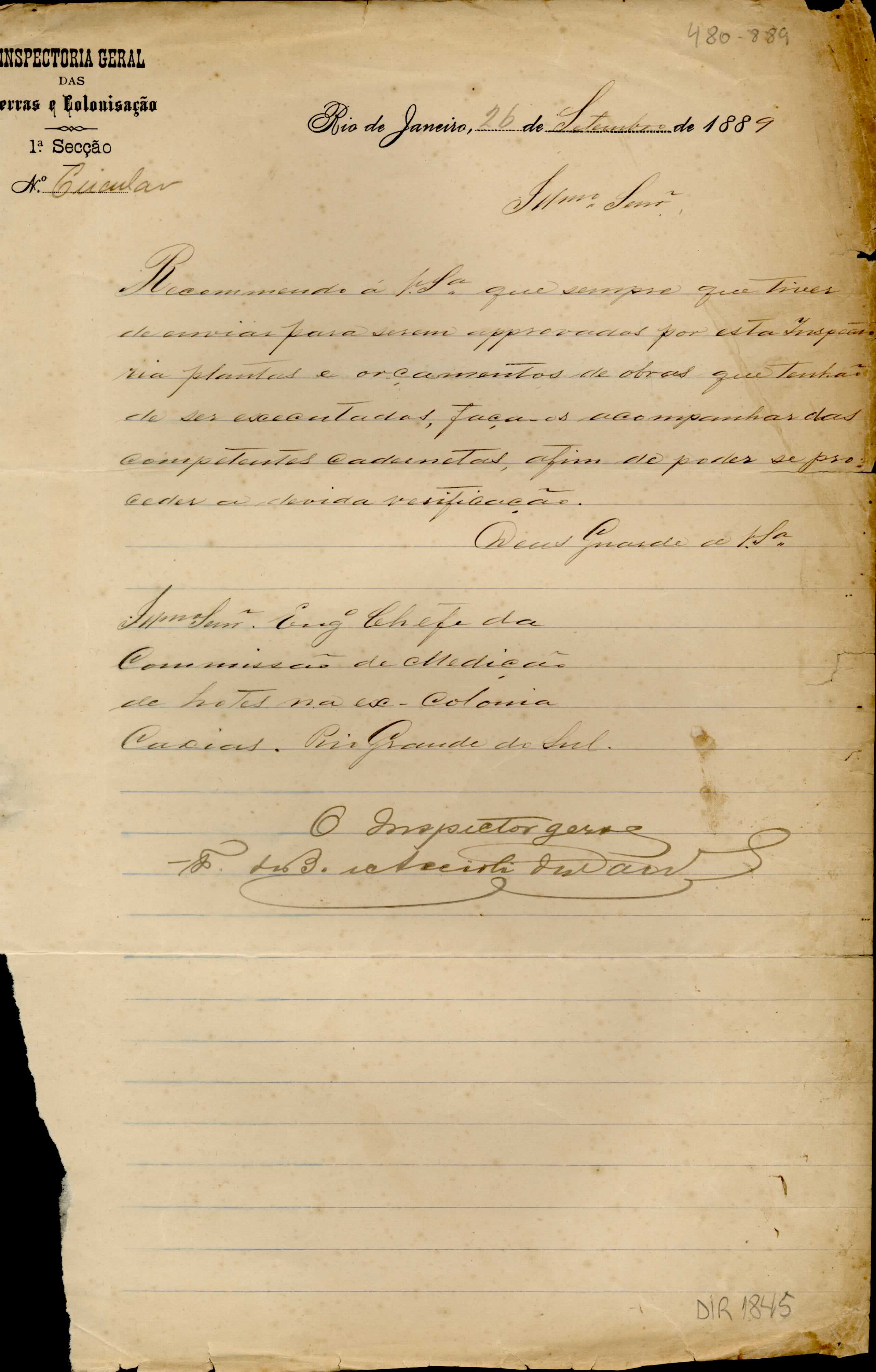 De Francisco de Barros e Accioli de Vasconcellos - Inspetor Geral das Terras e Colonização no Rio de Janeiro, para o Engenheiro Chefe de medições de lotes na ex-Colônia Caxias. Assunto: recomenda que ao enviar plantas e orçamentos para serem aprovados, devem acompanhá-los as cadernetas, para a devida verificação.