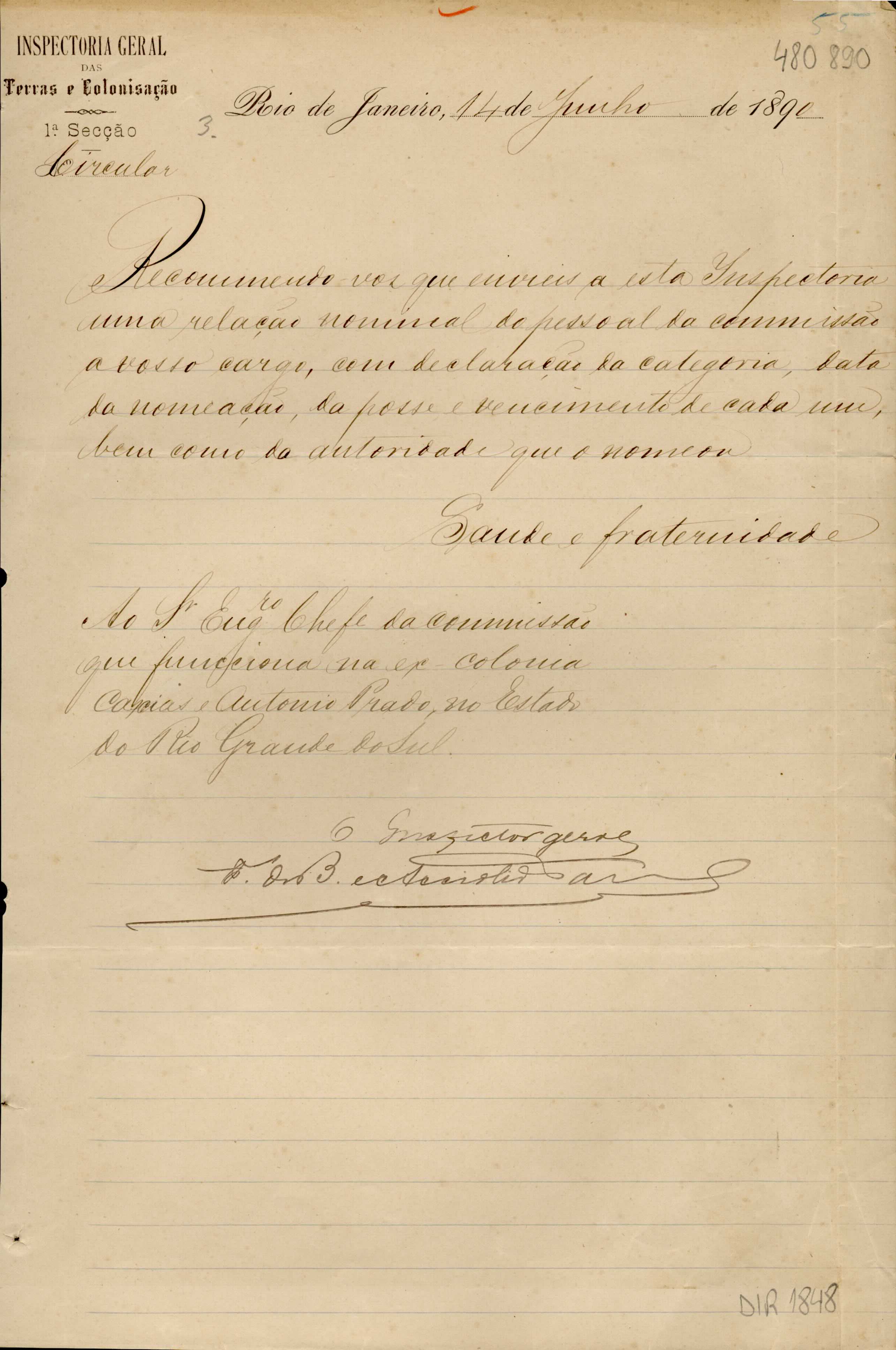 De Francisco de Barros e Accioli de Vasconcellos - Inspetor Geral das Terras e Colonização no Rio de Janeiro, para o Engenheiro Chefe de medições de lotes na ex-Colônia Caxias. Assunto: recomenda envio de relação nominal do pessoal da Comissão, com categoria, data de nomeação, data de posse, vencimentos e autoridade que nomeou.