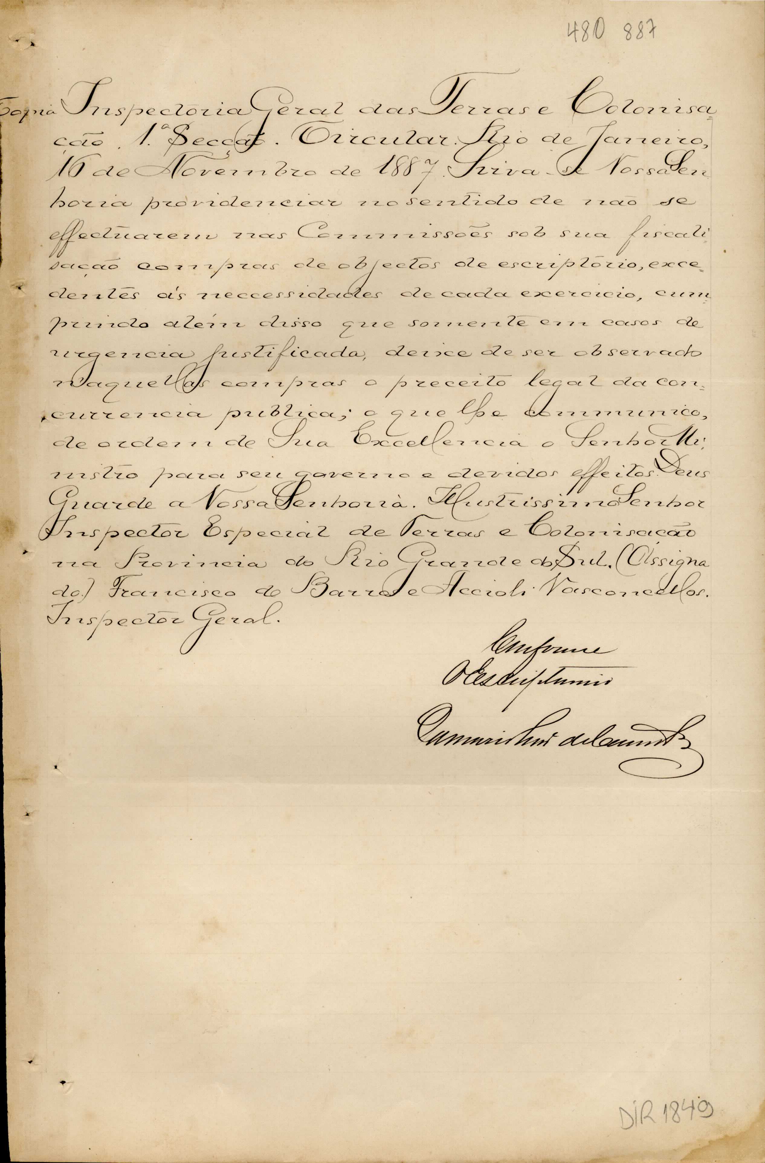 De Francisco de Barros e Accioli de Vasconcellos - Inspetor Geral das Terras e Colonização no Rio de Janeiro, para o Inspetor Especial de Terras e Colonização no Rio Grande do Sul. Assunto: informações e instruções sobre compras de objetos de escritório.