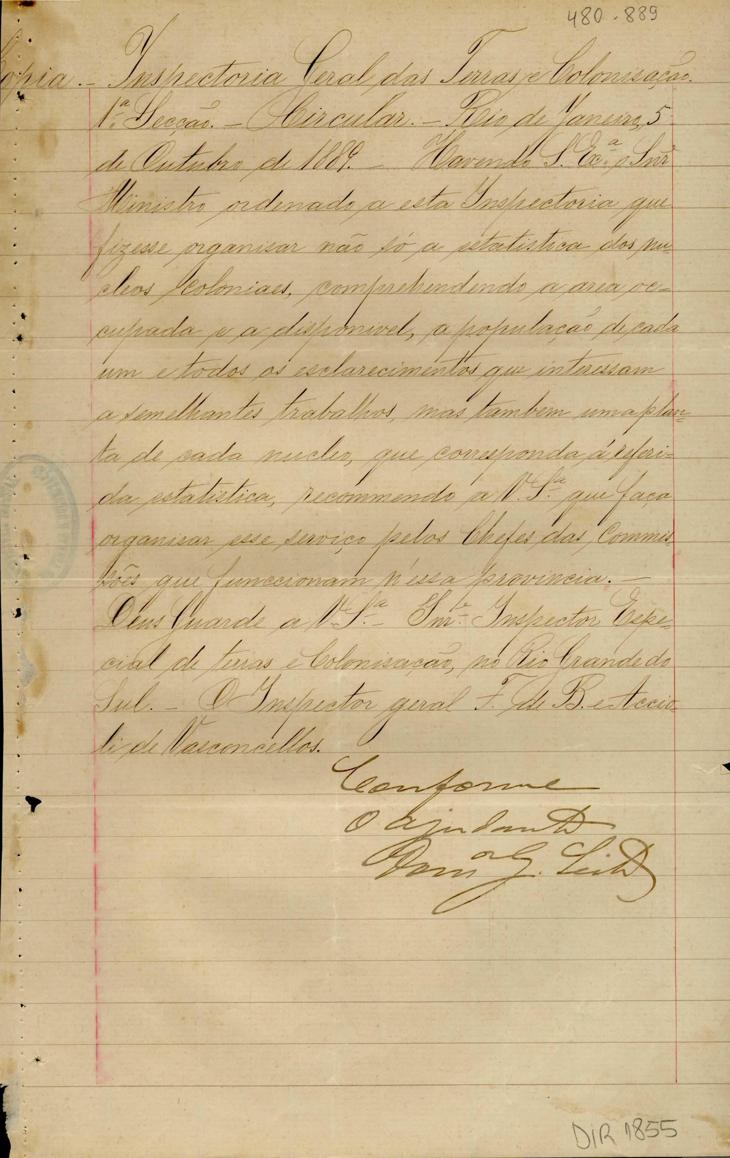 De Francisco de Barros e Accioli de Vasconcellos - Inspetor Geral das Terras e Colonização no Rio de Janeiro, para o Inspetor Especial de Terras e Colonização no Rio Grande do Sul. Assunto: solicita a organização da estatística dos núcleos coloniais e de uma planta de cada núcleo.