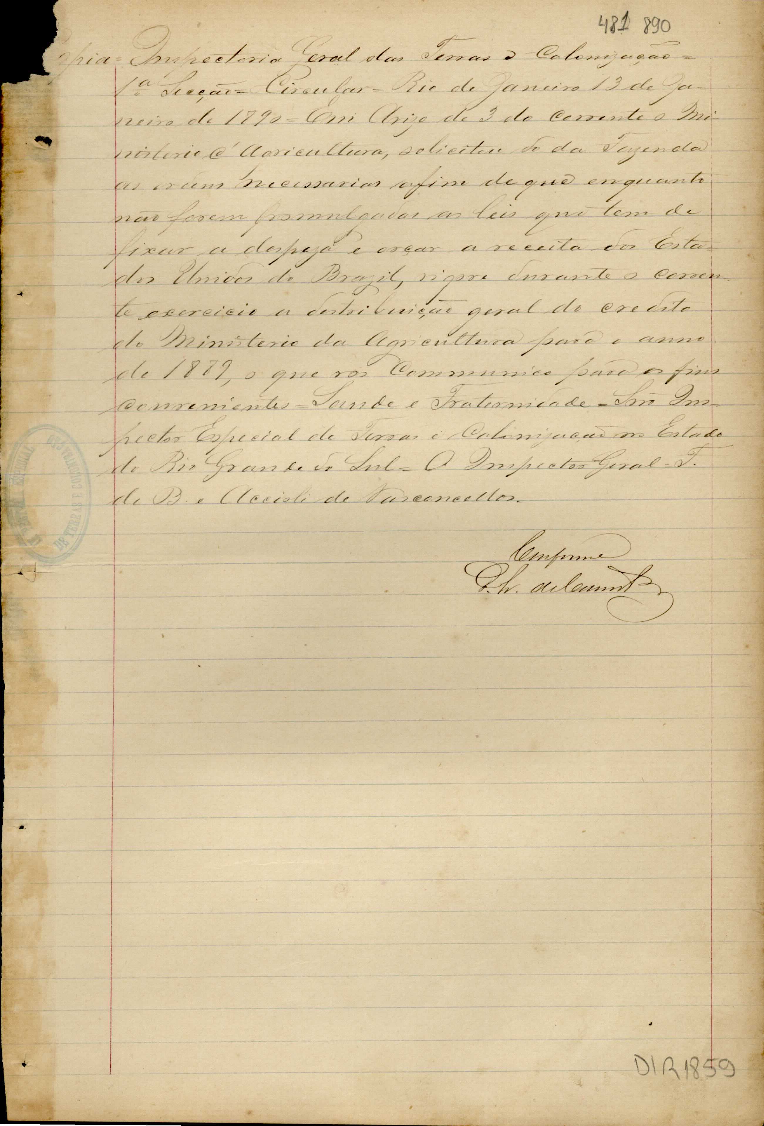 De Francisco de Barros e Accioli de Vasconcellos - Inspetor Geral das Terras e Colonização no Rio de Janeiro, para o Inspetor Especial de Terras e Colonização no Rio Grande do Sul. Assunto: comunica que deve vigorar a distribuição geral do crédito do Ministério da Agricultura, até que sejam promulgadas as leis.