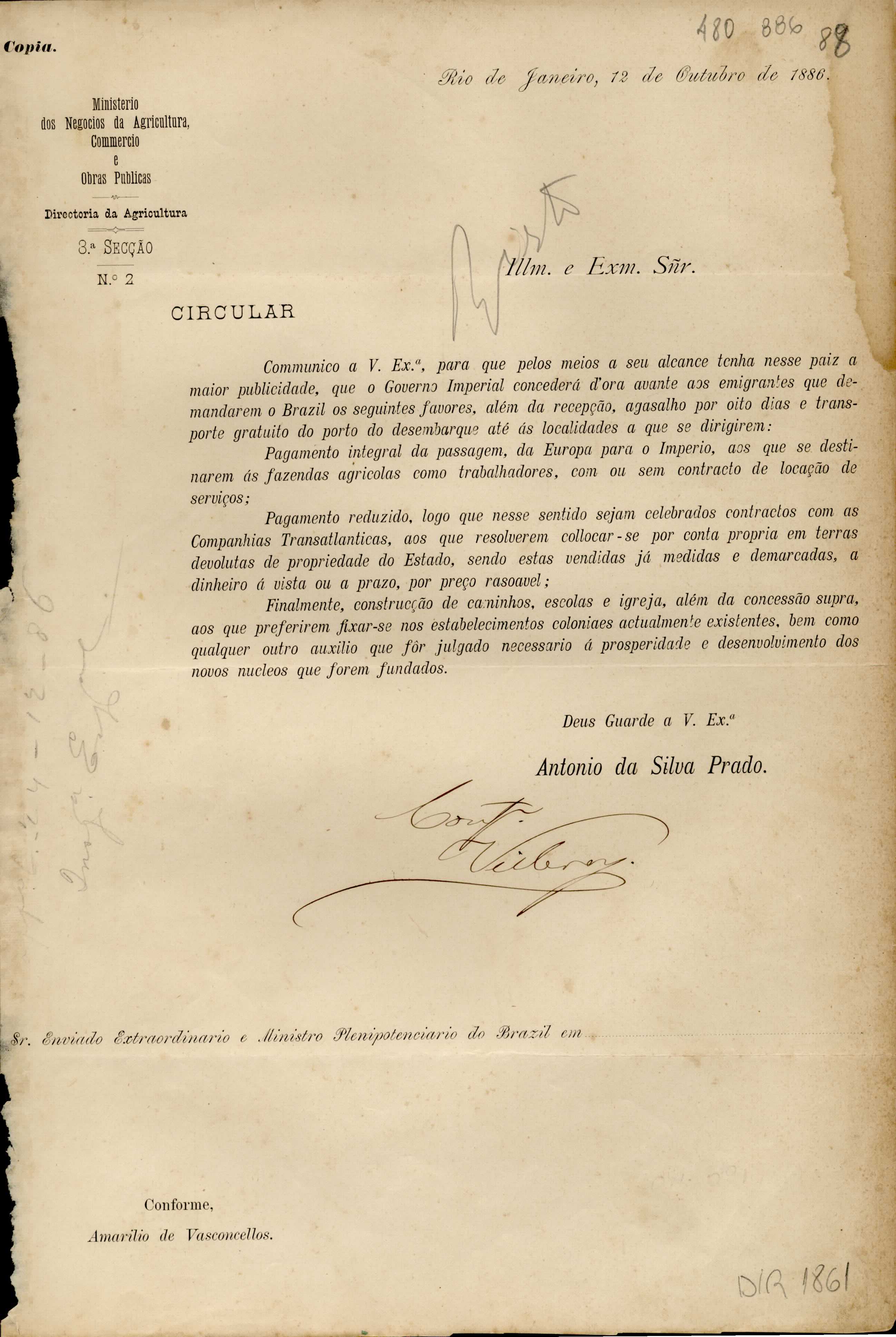 De Antonio da Silva Prado - Ministério dos Negócios da Agricultura, Comércio e Obras Públicas no Rio de Janeiro, para Manoel Barata Góes. Assunto: informação sobre os favores concedidos aos imigrantes chegados ao Brasil, pelo Governo Imperial.