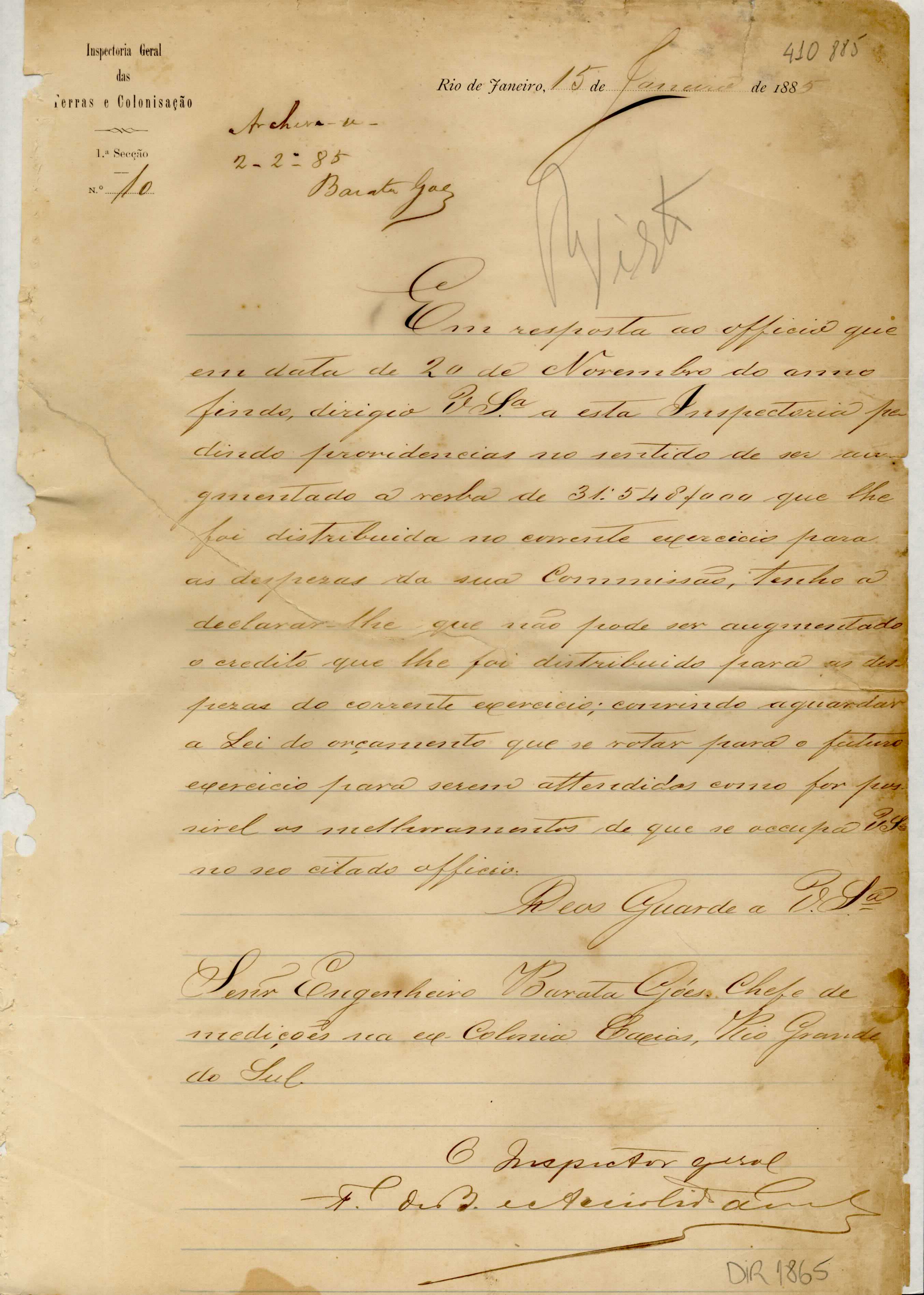 De Francisco de Barros e Accioli de Vasconcellos - Inspetor Geral das Terras e Colonização no RJ, para Manoel Barata Góes - Engenheiro Chefe de Medições na ex-Colônia Caxias. Assunto: questão de verbas; resposta ao pedido de aumento de verbas.