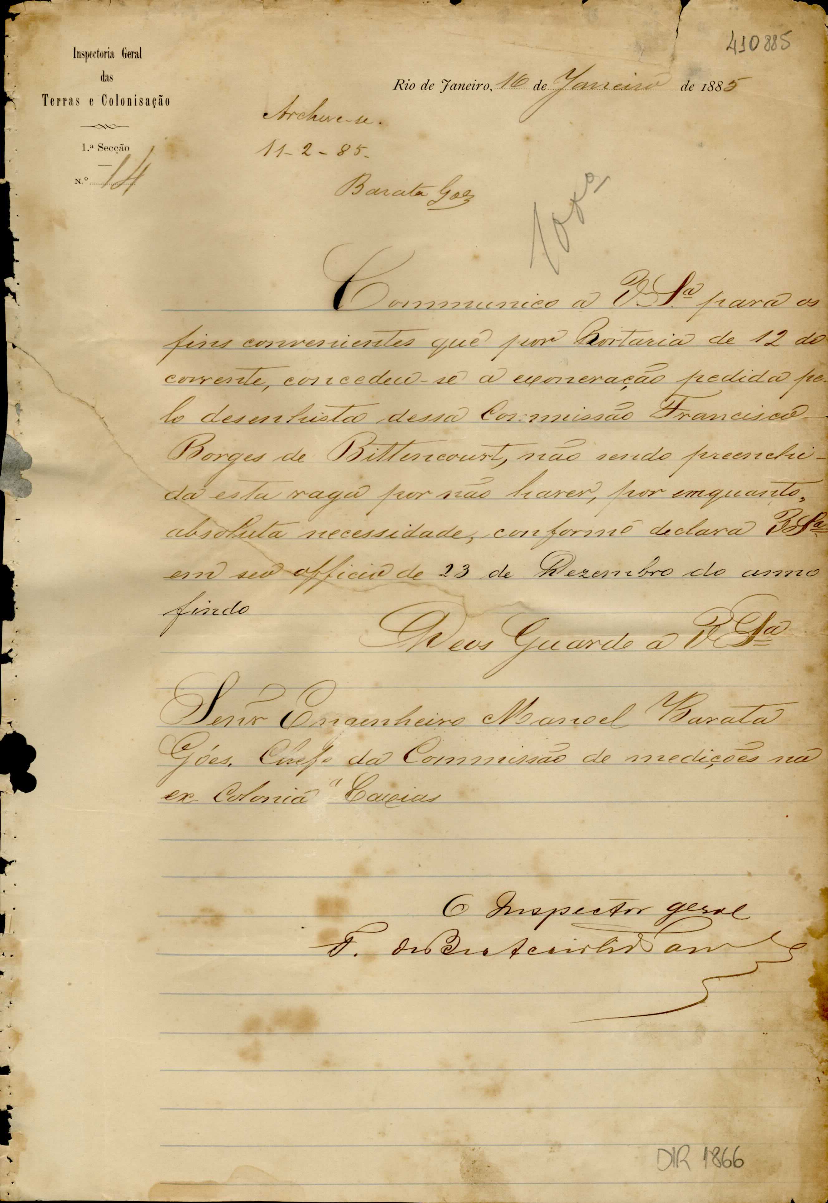 De Francisco de Barros e Accioli de Vasconcellos - Inspetor Geral das Terras e Colonização no RJ, para Manoel Barata Góes - Engenheiro Chefe de Medições na ex-Colônia Caxias. Assunto: comunica autorização para a exoneração de Francisco Borges de Bittencourt, desenhista da Comissão.