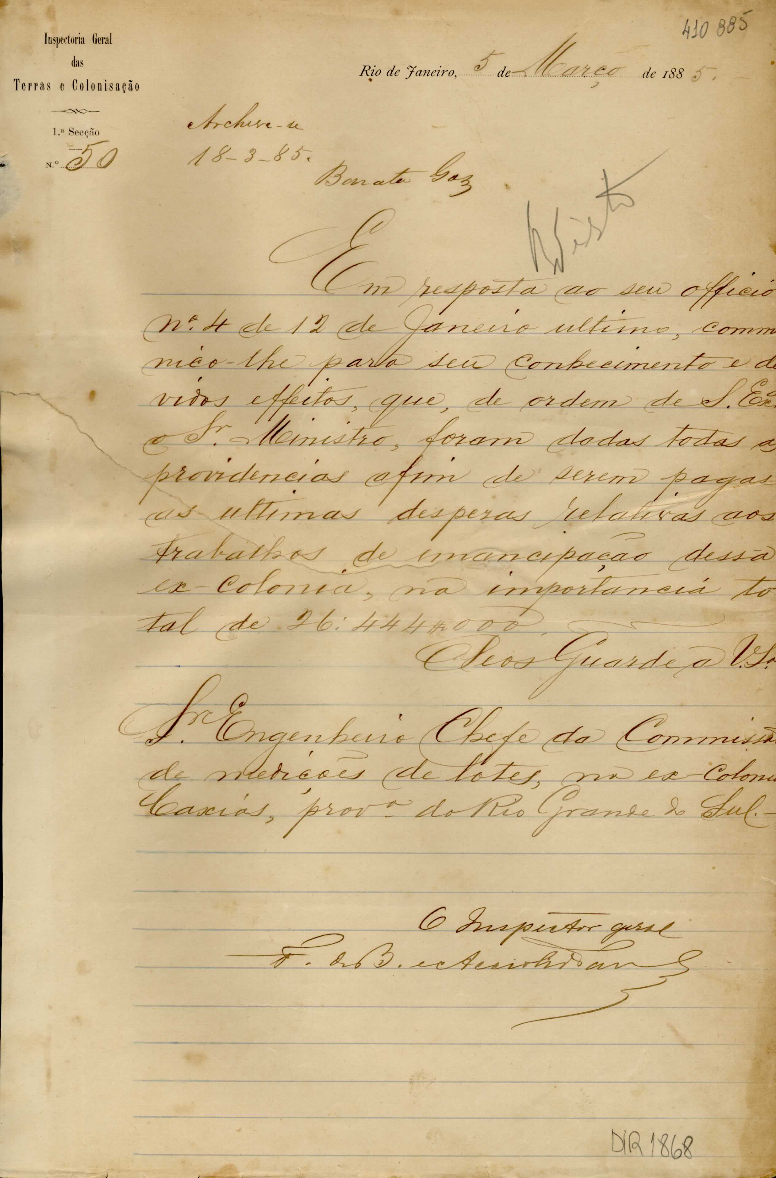 De Francisco de Barros e Accioli de Vasconcellos - Inspetor Geral das Terras e Colonização no RJ, para Manoel Barata Góes - Engenheiro Chefe de Medições na ex-Colônia Caxias. Assunto: comunica o pagamento das despesas relativas aos trabalhos com a emancipação da ex-colônia.