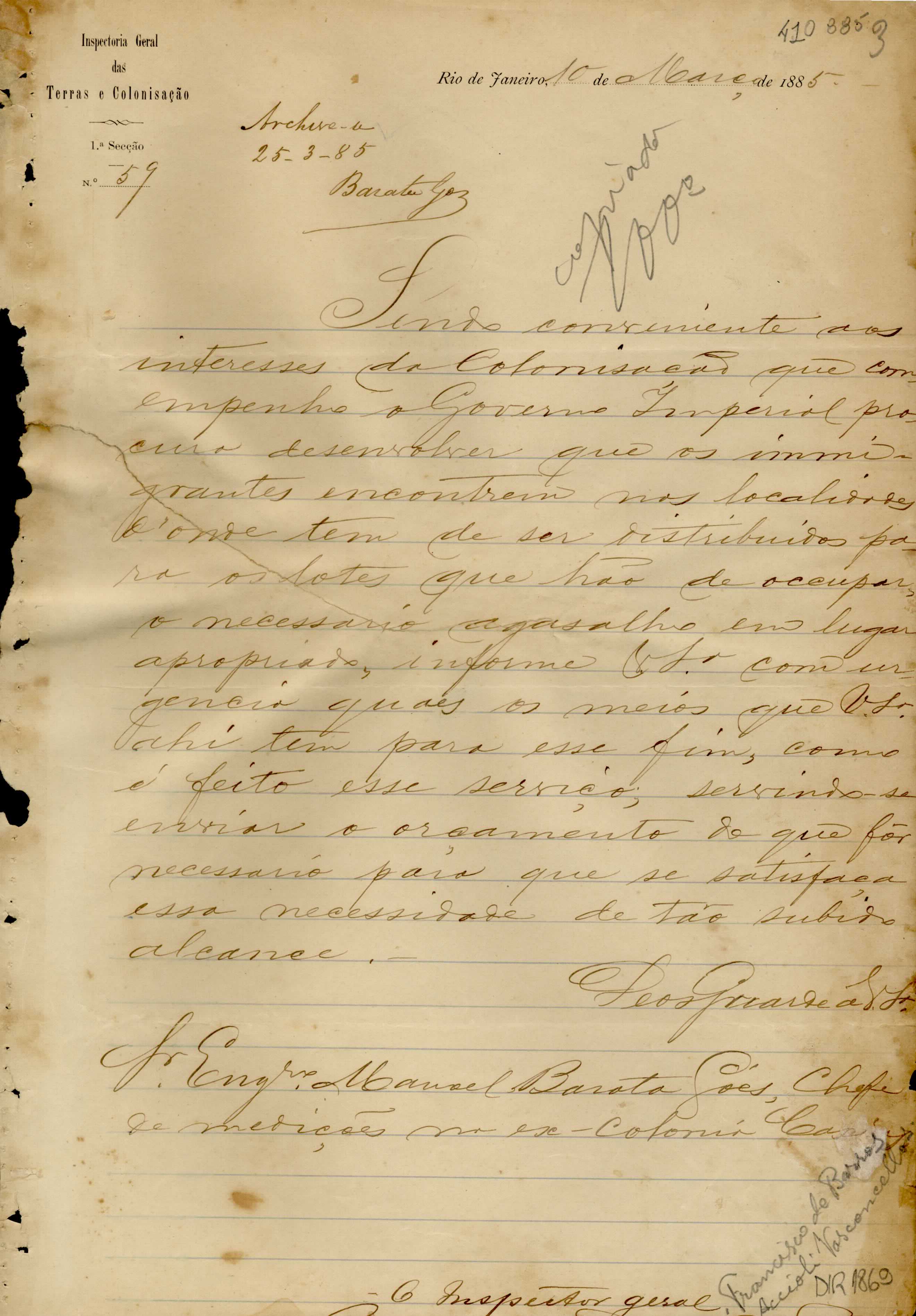 De Francisco de Barros e Accioli de Vasconcellos - Inspetor Geral das Terras e Colonização no RJ, para Manoel Barata Góes - Engenheiro Chefe de Medições na ex-Colônia Caxias. Assunto: solicita envio de informações e de orçamento para a construção de "agasalho"ou barracão para abrigar imigrantes.