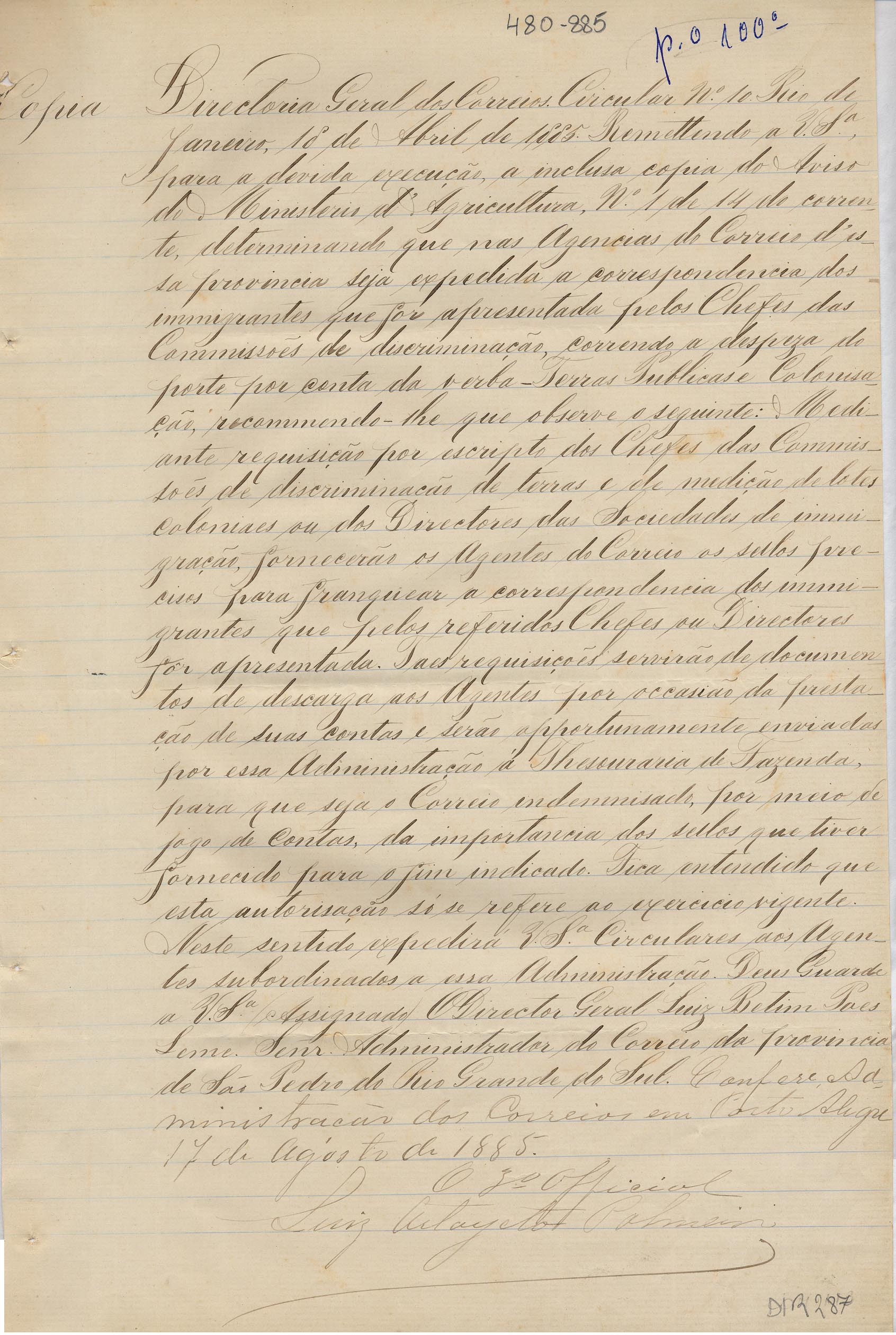 Cópia da circular de Luiz Betim Paes Leme - Diretor Geral dos Correios no Rio de Janeiro, para o Administrador do Correio da província de São Pedro do Rio Grande do Sul. Assunto: comunica aviso do Ministério da Agricultura de que a correspondência dos imigrantes apresentada pelos Chefes das Comissões, fica com a despesa por conta da verba "Terras Públicas e Colonização", durante o exercício vigente. Local: Rio de Janeiro.