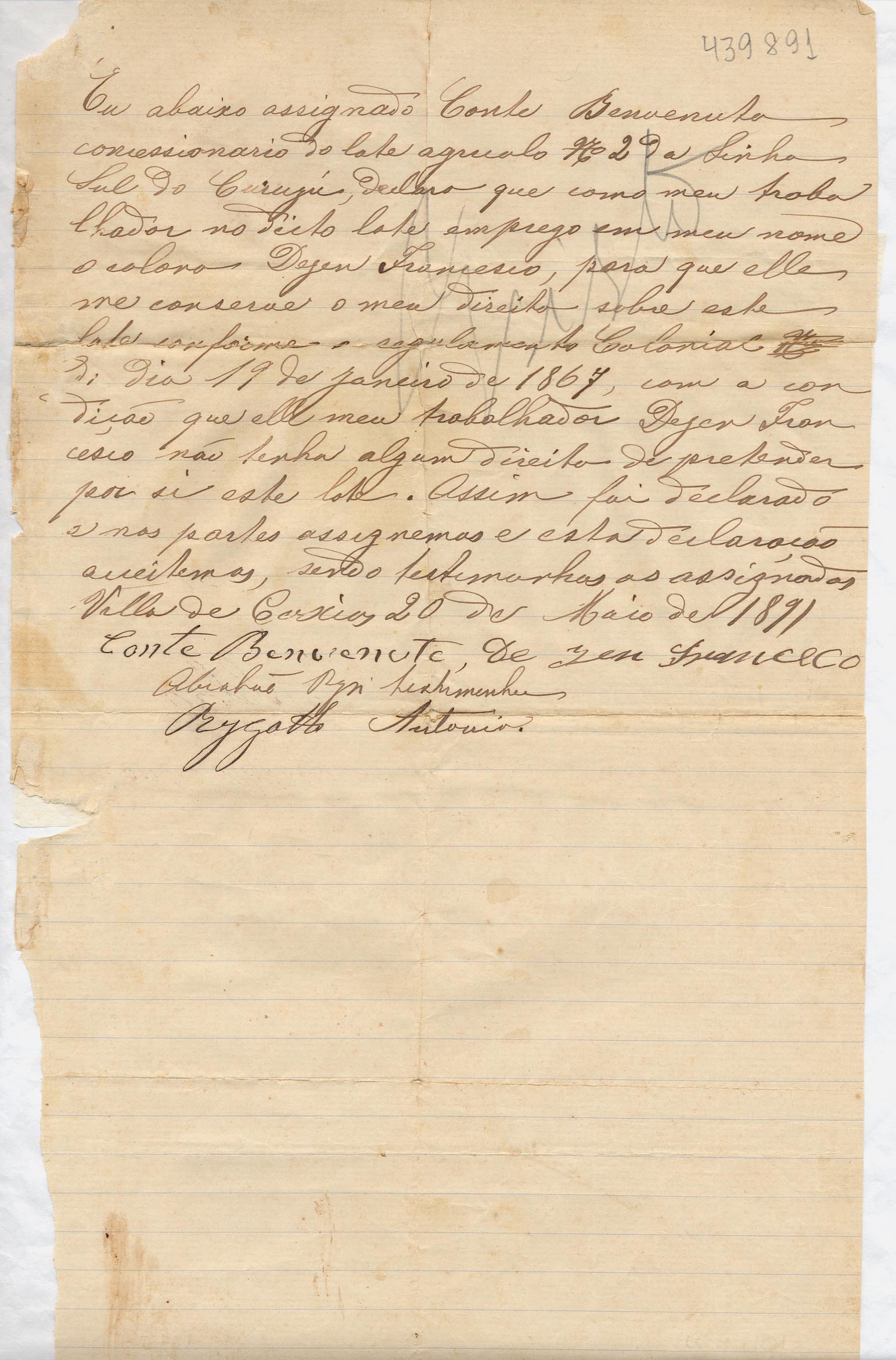 De Conte Benvenuto - Vila de Caxias. Assunto: declaração de direitos de propriedade. Local: Vila de Caxias.