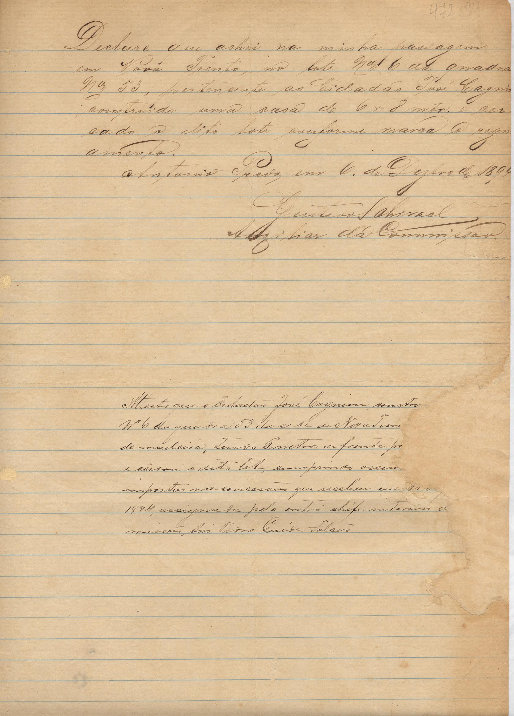 De Gustavo Schinael - Auxiliar da Comissão em Antonio Prado. Assunto: declara que no lote nº 16 da quadra nº 53 em Nova Trento, pertencente à José Cagnini, está construída uma casa e o lote está cercado.