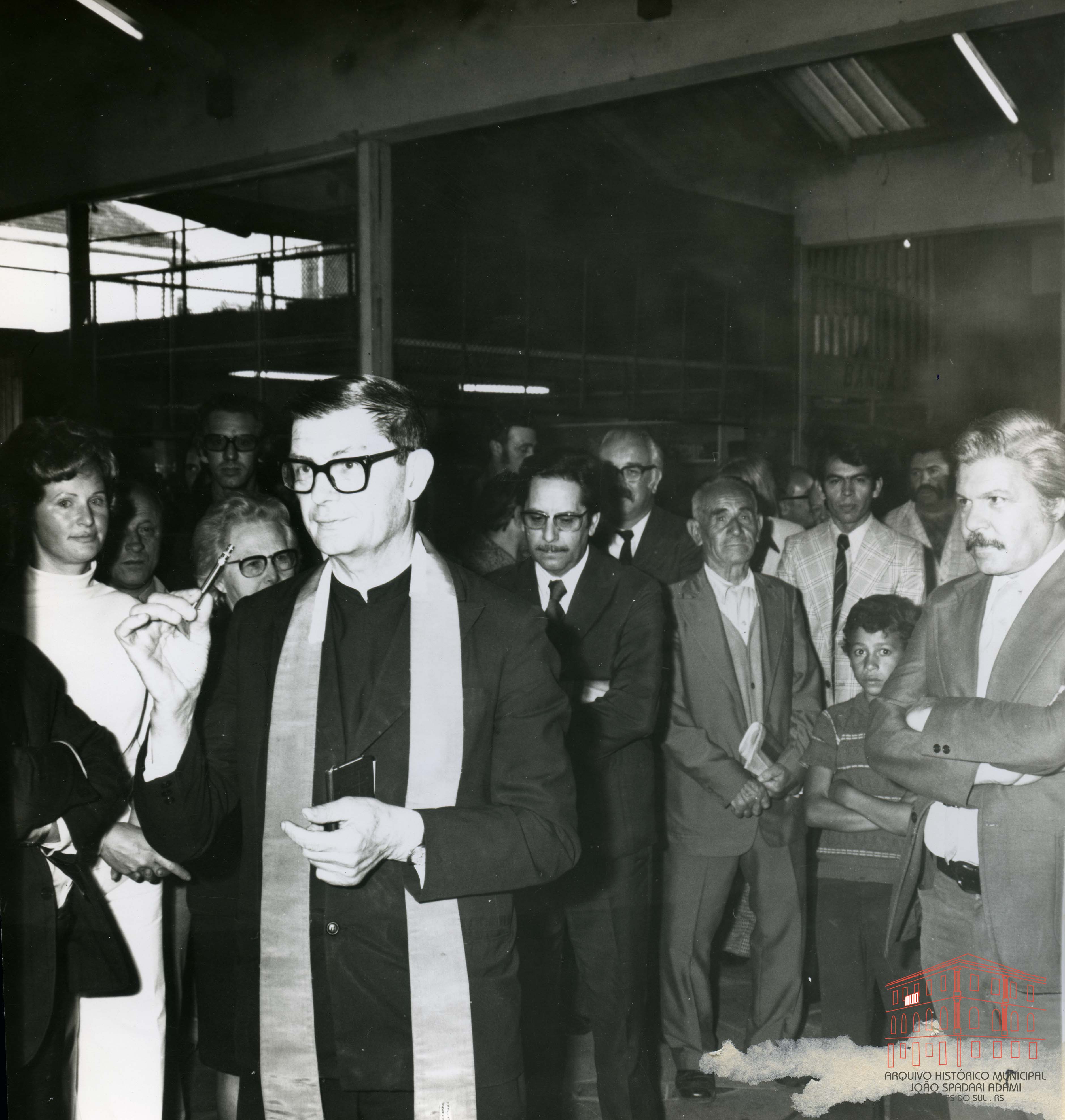 Sacerdote Eugênio Giordani, à esquerda, Laís Moretto Kuser, Diretora do DMAP e, à direita, Prefeito Mário Bernardino Ramos, na inauguração do Super 42 Armazéns Populares, localizado na rua Vinte de Setembro - Caxias do Sul, junto ao Mercado Público Municipal